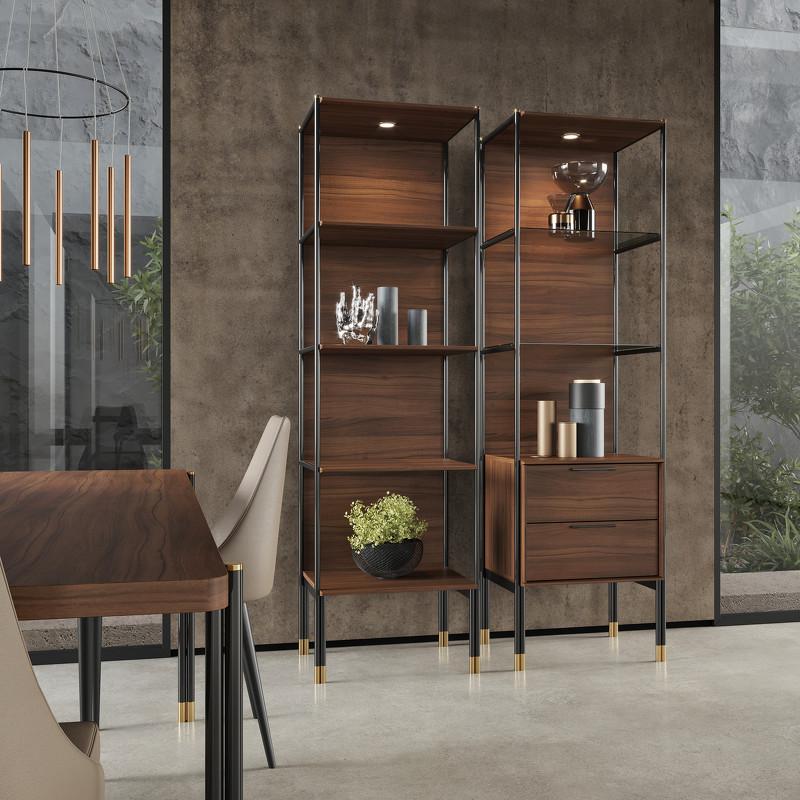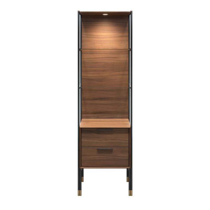 Витрина на высоких ножках от бренда Mod Interiors изготовлена из высококачественного шпонированного МДФ высокой плотности. Металлические ножки с латунными колпачками и металлические ручки подчеркивают изысканность модели. Витрина оснащена двумя выдвижными ящиками, двумя стеклянными полками и подсветкой. Все ящики снабжены направляющими системы soft-close. Уникальная система последнего поколения добавляет невероятную плавность открывания/закрывания и высокую динамическую нагрузку.