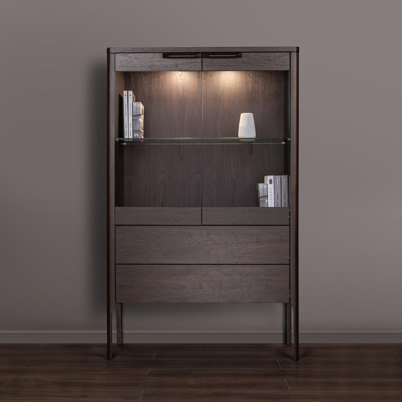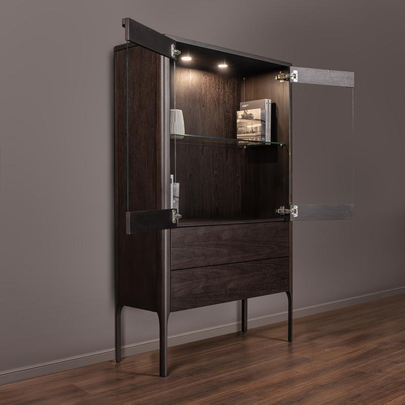 Витрина испанского бренда MOD Interiors с двумя стеклянными дверками, 2 ящиками и подсветкой станет украшением любой гостиной в современном стиле. Корпус витрины изготовлен из высококачественного МДФ высокой плотности, Ножки и ручки - из массива дерева. Отделка - натуральный шпон ореха, тонированного в цвет горького шоколада. Ящики снабжены направляющими системы soft-close. Уникальная система последнего поколения добавляет невероятную плавность открывания/закрывания. Высота фасада ящиков 19.8 см Высота дверок 89.2 см Высота ножек 30 см Ширина каждой дверки 44.9 см
