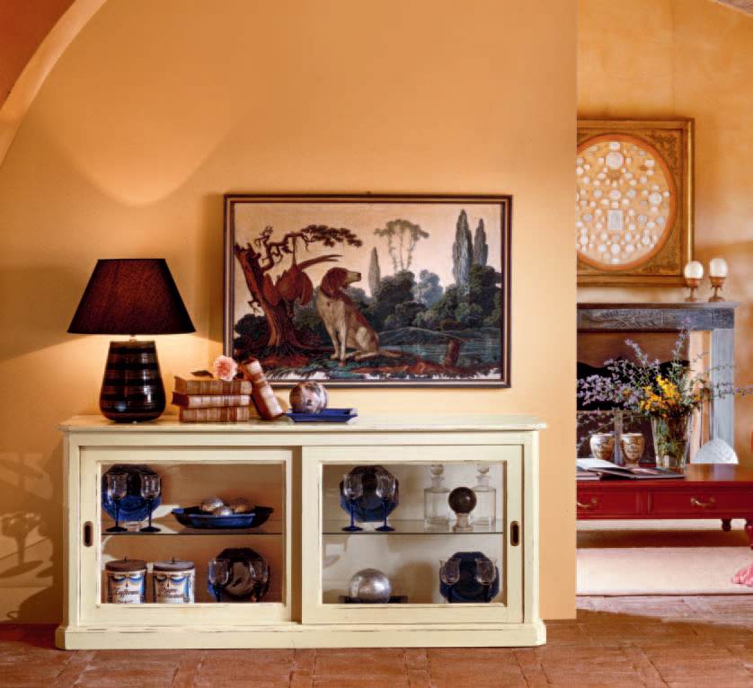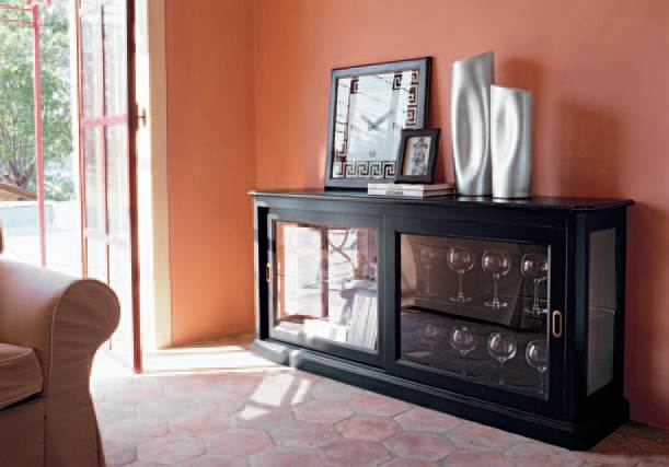 Витрина с 2-мя раздвижными дверцами, полки выполнены из стекла. Возможны другие варианты отделки.