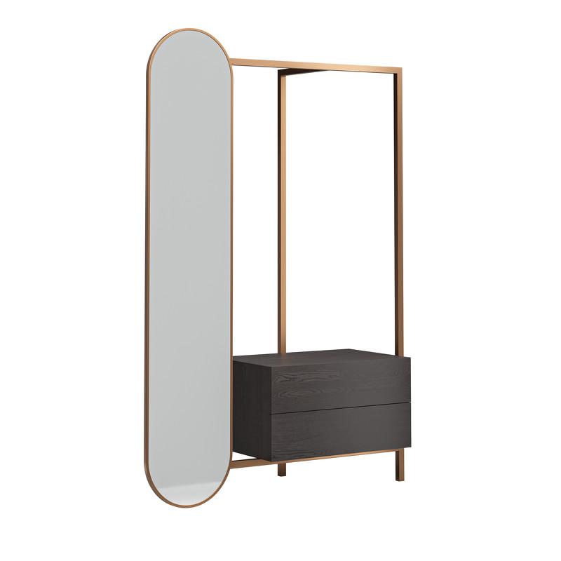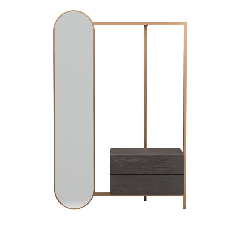 Напольная вешалка для одежды от бренда Fratelli Barri в современном стиле. Такой предмет мебели часто ставят в спальне как напольное зеркало с функцией хранения. Единая конструкция состоит из зеркала, двух вместительных ящиков и штанги. Благодаря ящикам, можно организовать удобное хранение всего необходимого. Ящики оснащены плавным закрытием "soft close". Тумба с ящиками изготовлена из высококачественного МДФ. Отделка - натуральный шпон ореха тонированный в цвет горького шоколада. Штанга и обрамление зеркала выполнены из нержавеющей стали в цвете латунь.