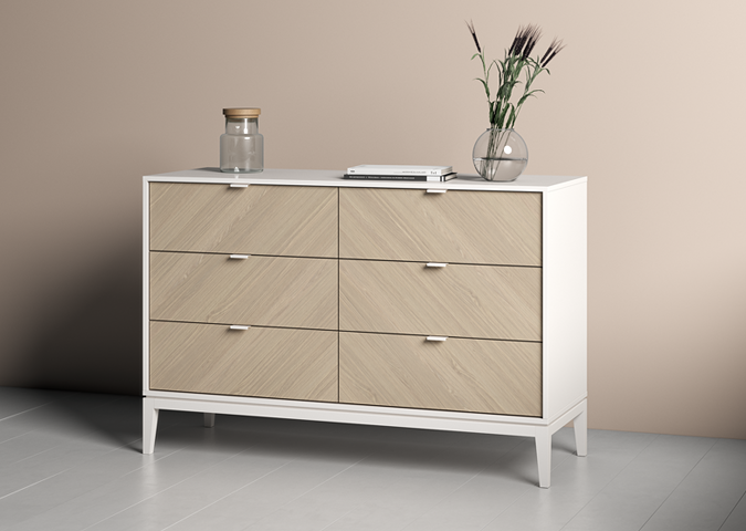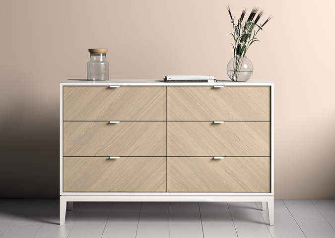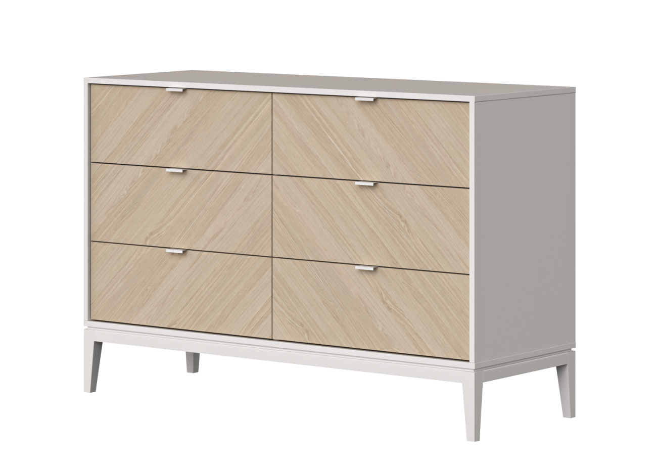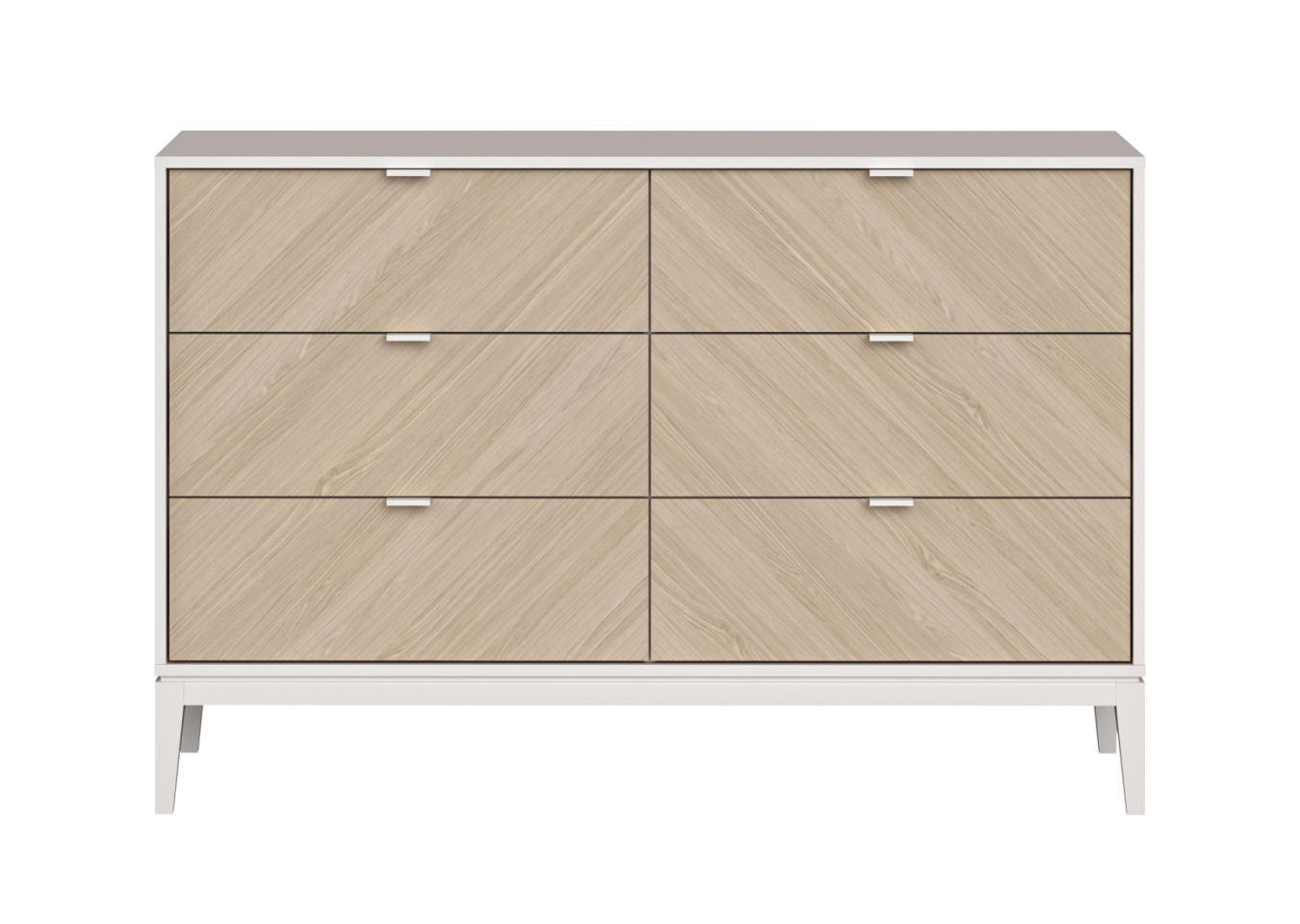Комод Fjord 6 ящиков Высота: 90,4 см Ширина: 136 см Глубина: 49 см Основание: массива бука Корпус: МДФ под эмалью Фасады: шпон дуба Ящики на бесшумных направляющих с доводчиками