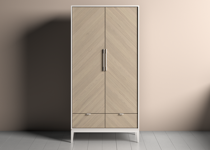 Шкаф Fjord 2-х створчатый Высота: 200 см Ширина: 100 см Глубина: 55 см Основание: массива бука Корпус: МДФ под эмалью Фасады: шпон дуба Шкаф Fjord имеет два отделения с полками и штангой, вместительный ящик на бесшумных направляющих с доводчиками