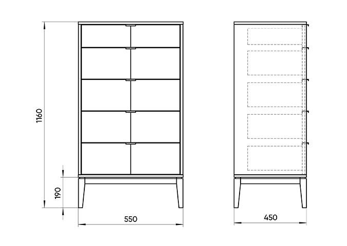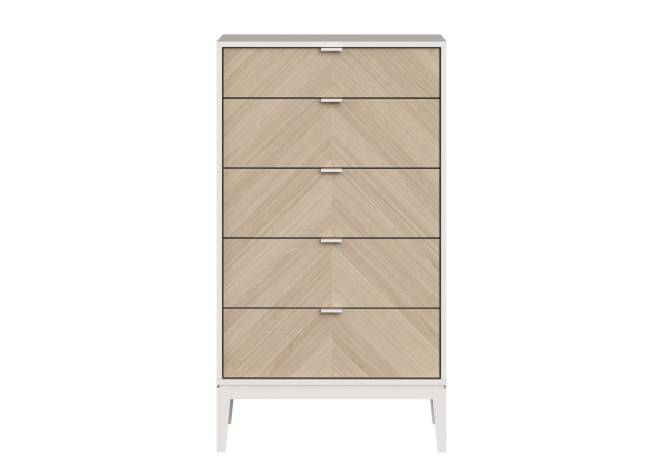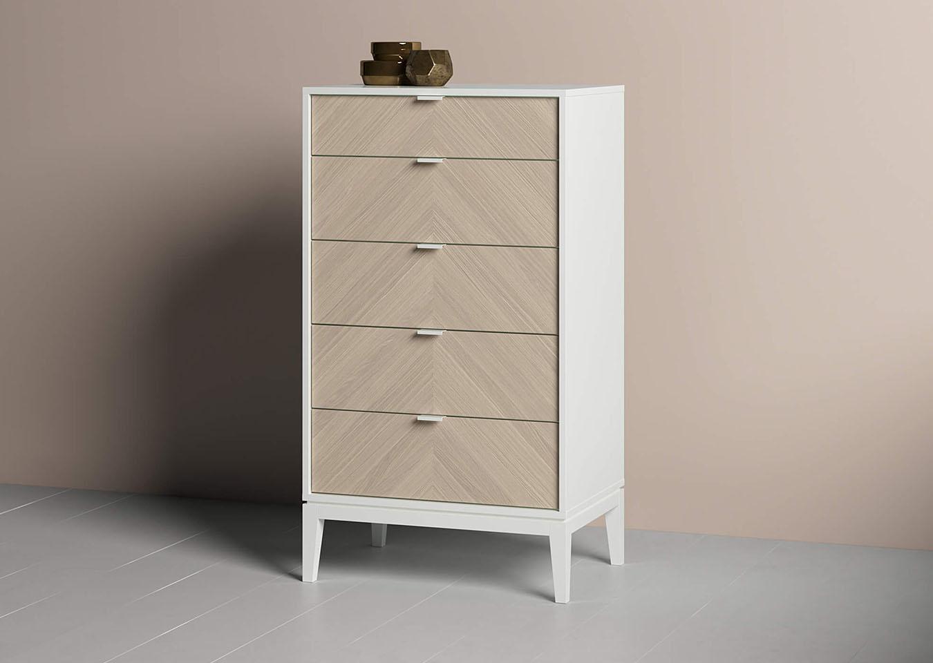 Комод Fjord 5 ящиков Высота: 116 см Ширина: 55 см Глубина: 45 см Основание: массива бука Корпус: МДФ под эмалью Фасады: шпон дуба Ящики на бесшумных направляющих с доводчиками