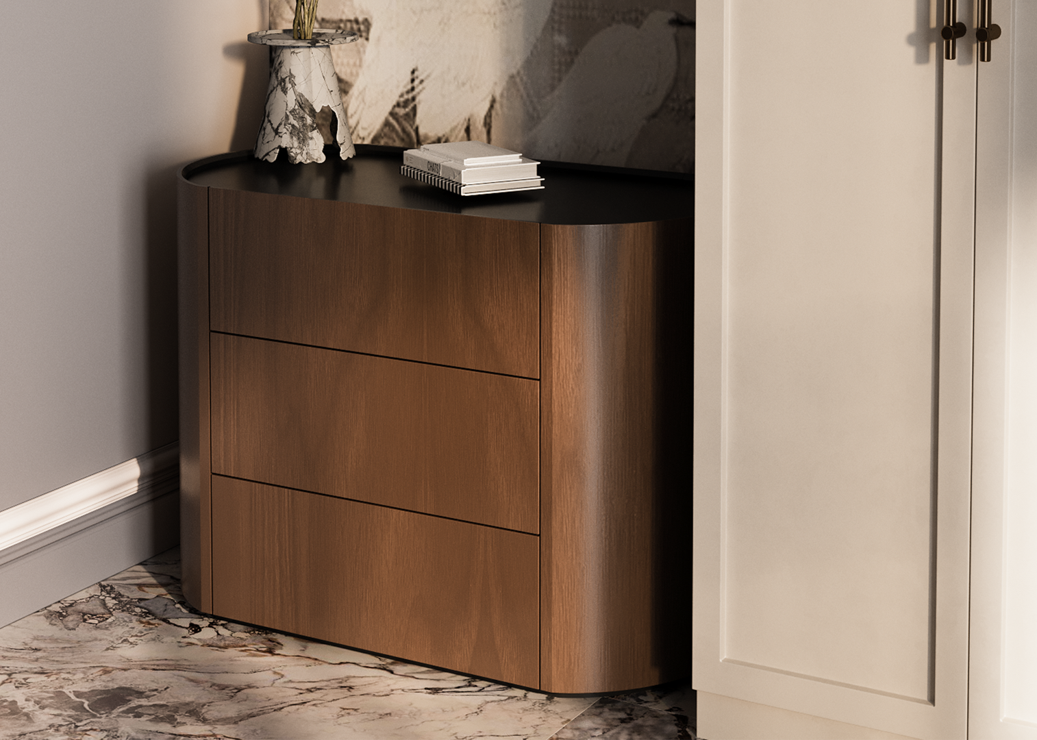 Комод Lagom 3 ящика ширина 100 см Высота: 72,2 см Ширина: 100 см Глубина: 51 см Материал: шпон дуба, шпон березы, МДФ Каркас ящиков: ЛДСП Покрытие корпуса: шпон ореха, лак Покрытие столешницы: эмаль RAL 9005