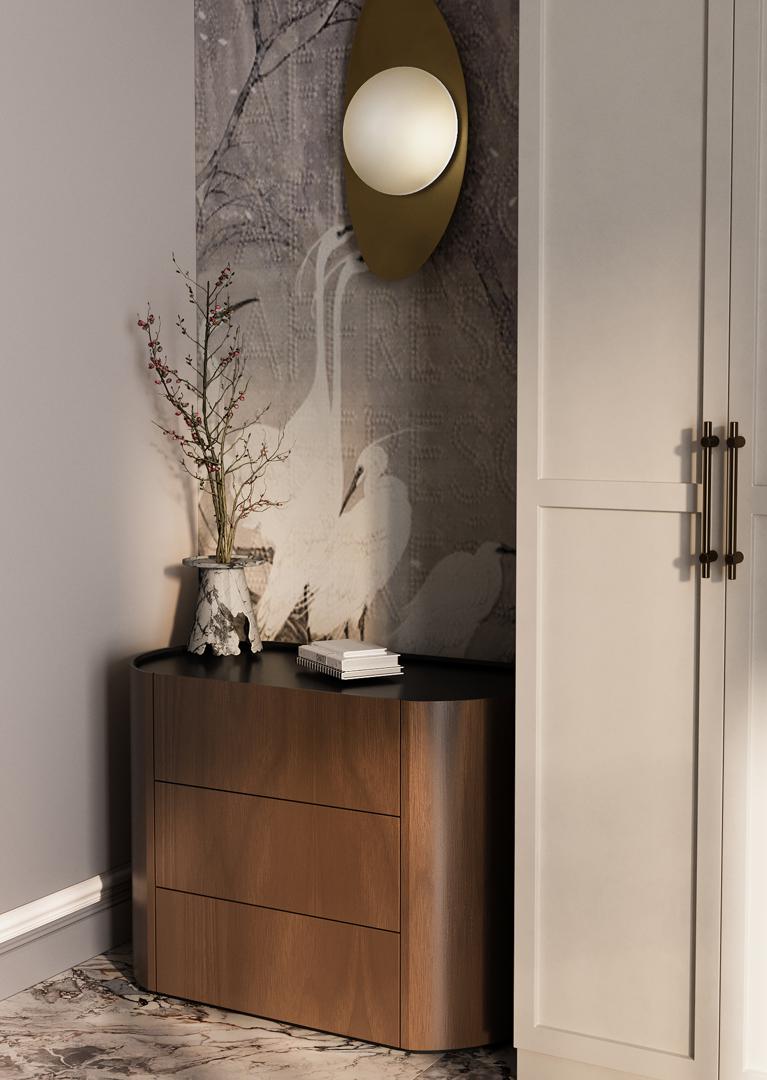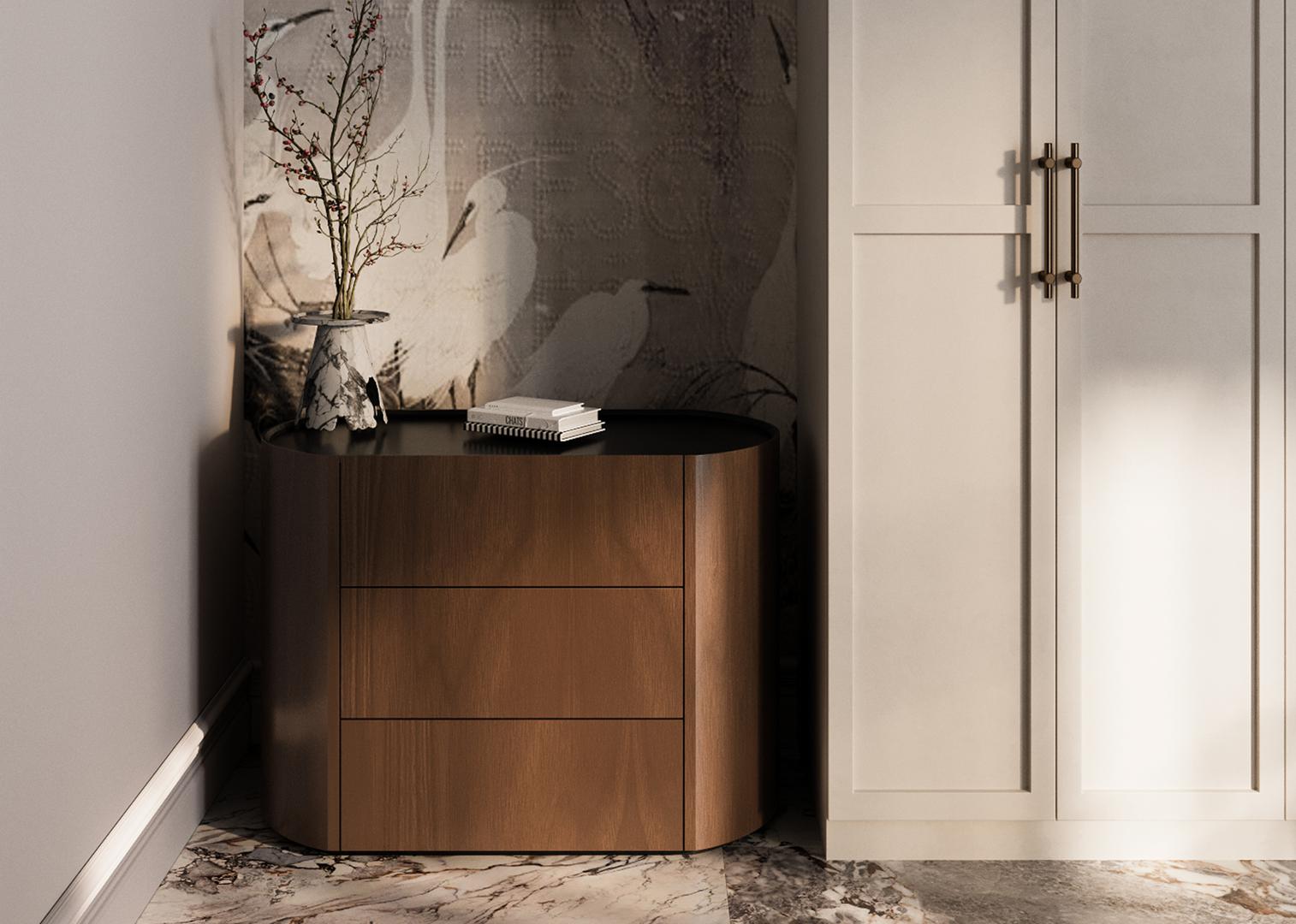 Комод Lagom 3 ящика ширина 90 см Высота: 72,2 см Ширина: 90 см Глубина: 51 см Материал: шпон дуба, шпон березы, МДФ Каркас ящиков: ЛДСП Покрытие корпуса: шпон ореха, лак Покрытие столешницы: эмаль RAL 9005