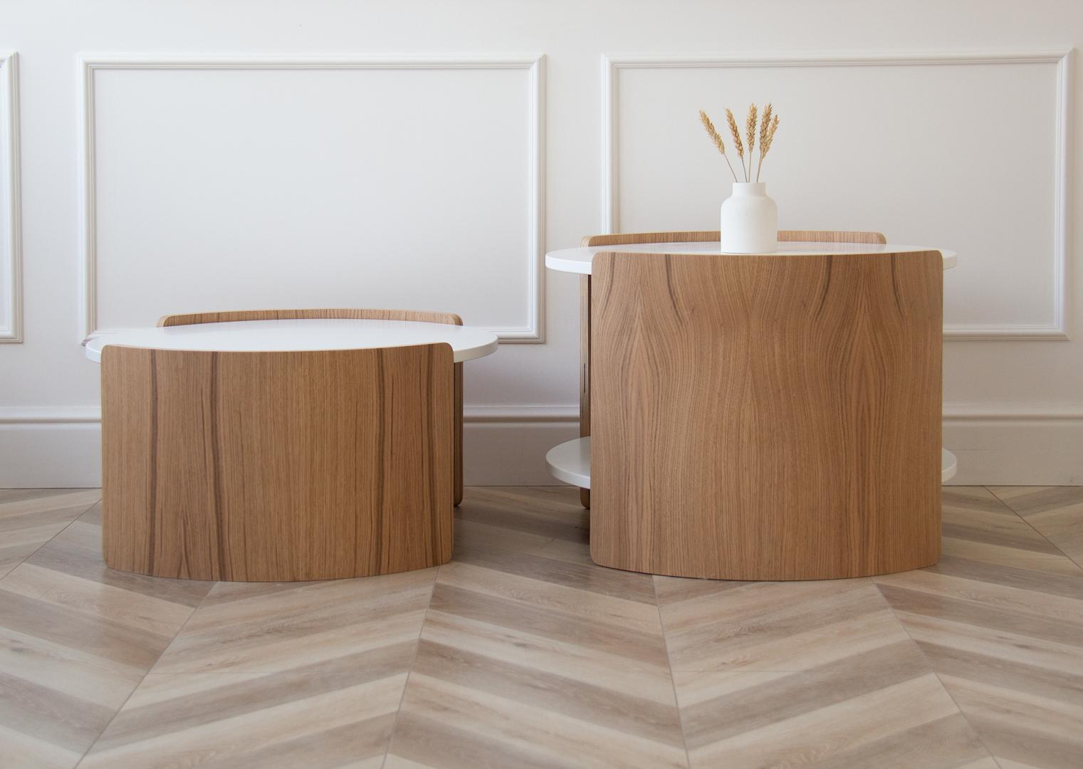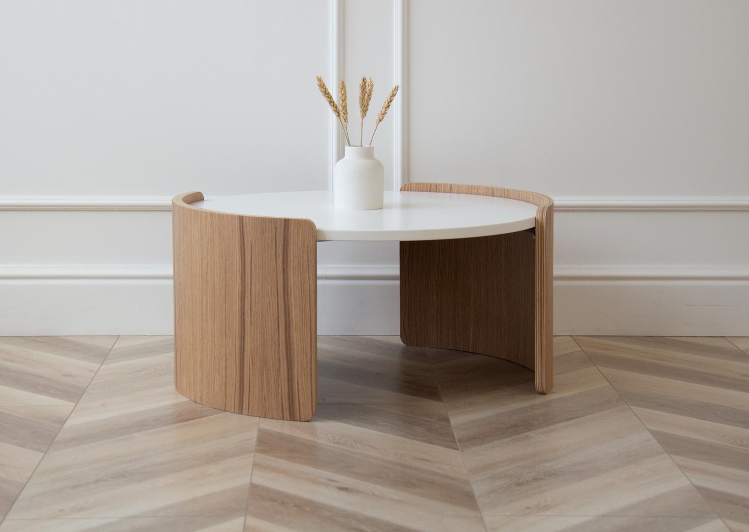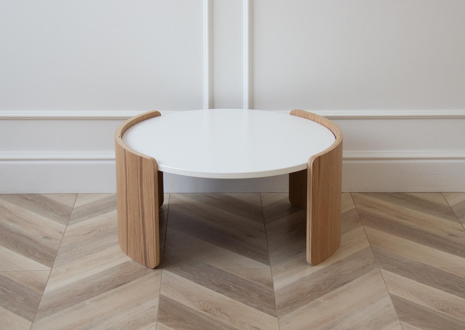 Оригинальные столики из коллекции Lagom станут ярким акцентом любой комнаты Можно организовать уютную зону в гостиной, использовать столики в качестве прикроватных или дополнить интерьер детской комнаты При производстве используется шпон натурального дуба, покрытие белый полупрозрачный лак, столешница под эмалью Высота: 32 см Диаметр столешницы: 62 см Диаметр основания: 65 см Основание: береза, шпон дуба, лак Столешница: МДФ 12 мм, эмаль RAL 9003