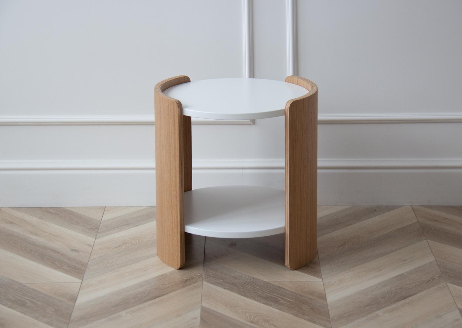 Оригинальные столики из коллекции Lagom станут ярким акцентом любой комнаты Можно организовать уютную зону в гостиной, использовать столики в качестве прикроватных или дополнить интерьер детской комнаты При производстве используется шпон дуба, покрытие белый полупрозрачный лак, столешница под эмалью Высота: 45 см Диаметр столешницы: 39.4 см Диаметр основания: 43 см Основание: береза, шпон дуба, лак Столешница: МДФ 12 мм, эмаль RAL 9003