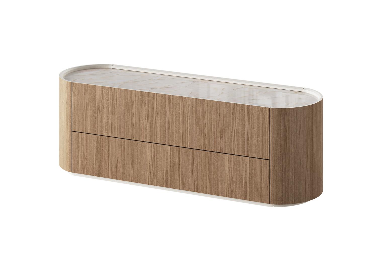 Тумба Lagom под ТВ 2 ящика ширина 140 см Высота: 46 см Ширина: 136.6 см Глубина: 41 см Материал: МДФ Каркас ящиков: ЛДСП Покрытие корпуса: шпон дуба, лак, эмаль RAL NCS S 0804-Y30R Столешница: акриловый камень Staron Supreme Latte Cream (VL343)