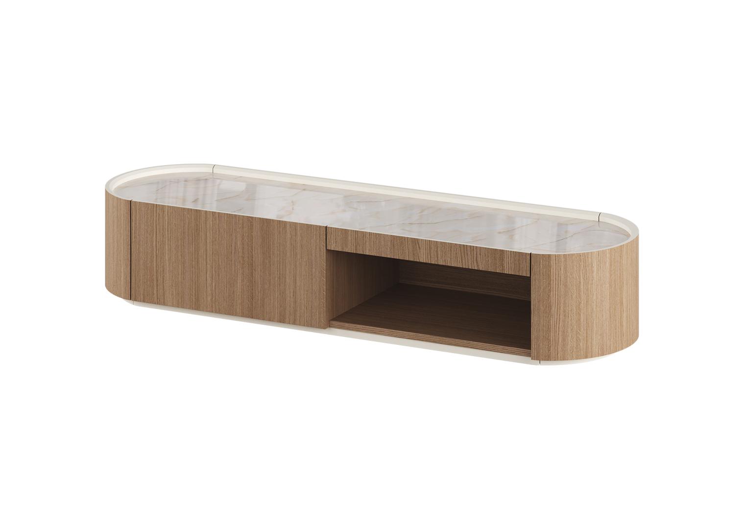 Тумба Lagom под ТВ 1 ящик 1 полка ширина 140 см Высота: 26 см Ширина: 136.6 см Глубина: 41 см Материал: МДФ Каркас ящиков: ЛДСП Покрытие корпуса: шпон дуба, лак, эмаль RAL NCS S 0804-Y30R Столешница: акриловый камень Staron Supreme Latte Cream (VL343)