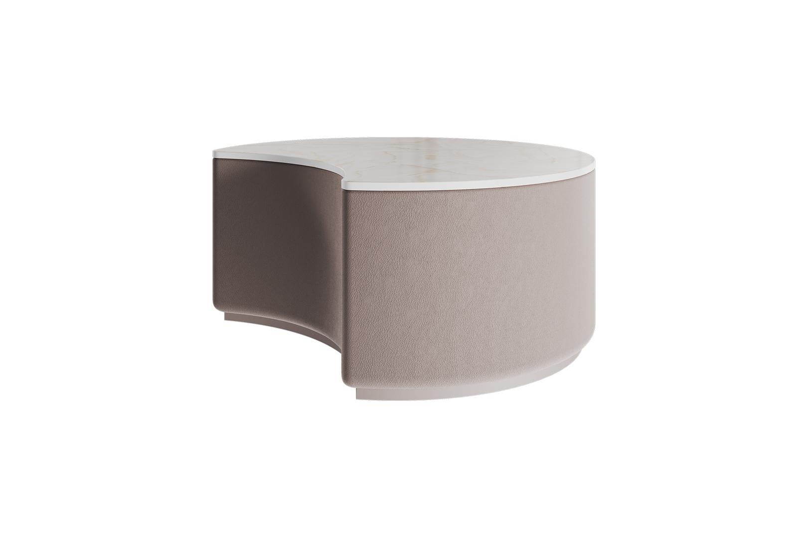 Оригинальные столики Sun станут ярким акцентом любой комнаты Можно организовать уютную зону в гостиной Высота: 30 см Диаметр столешницы: 66 см Основание: береза, экокожа Столешница: акриловый камень Staron Supreme Latte Cream (VL343)
