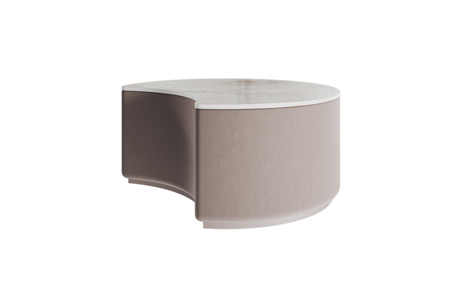 Оригинальные столики Sun станут ярким акцентом любой комнаты Можно организовать уютную зону в гостиной Высота: 30 см Диаметр столешницы: 66 см Основание: береза, экокожа Столешница: акриловый камень Staron Supreme Ocean View (VO171)