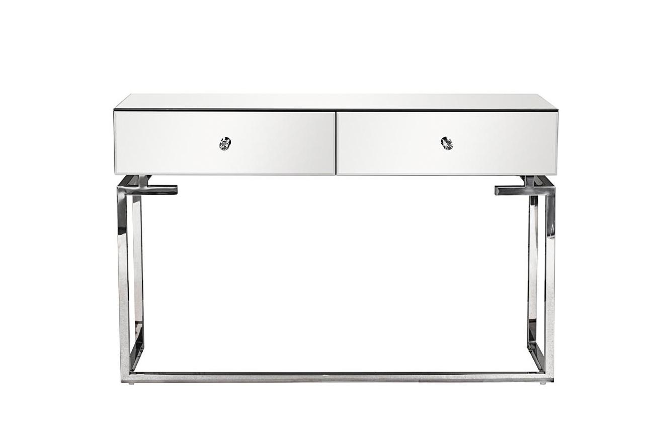 description-full - Эффектная зеркальная консоль украсит вашу спальную комнату, гостиную или гардероб. Два удобных выдвижных ящика подходят для хранения косметики, украшений, щеток и других мелочей. Опора из полированной стали заменяет традиционные ножки и прекрасно сочетается с серебристым зеркалом столешницы и фасада. Прямые линии и зеркальная облицовка позволяют вписать консоль в интерьер в любом цветовом решении, добавляя в обстановку элементы игры и артистизма.