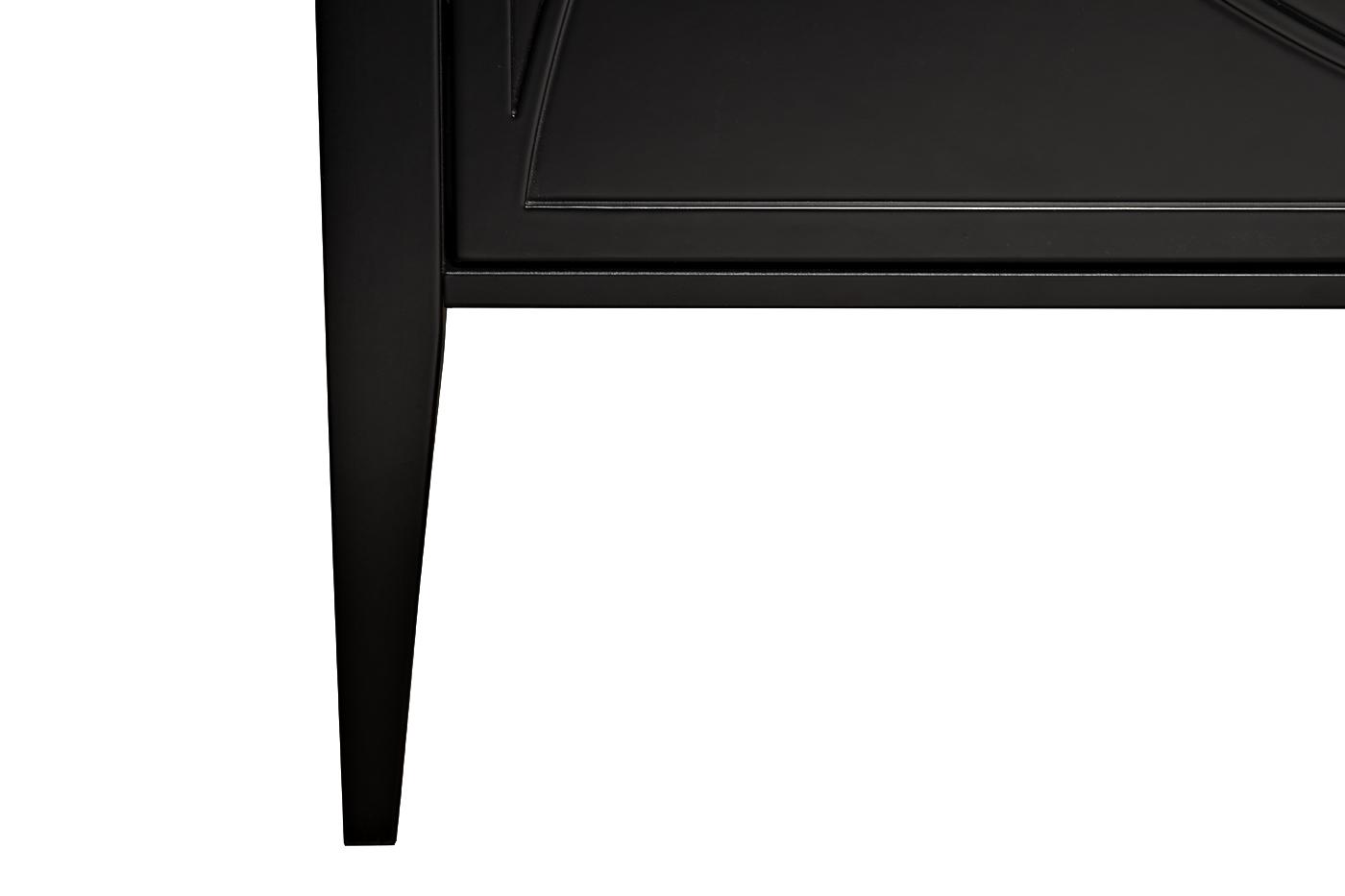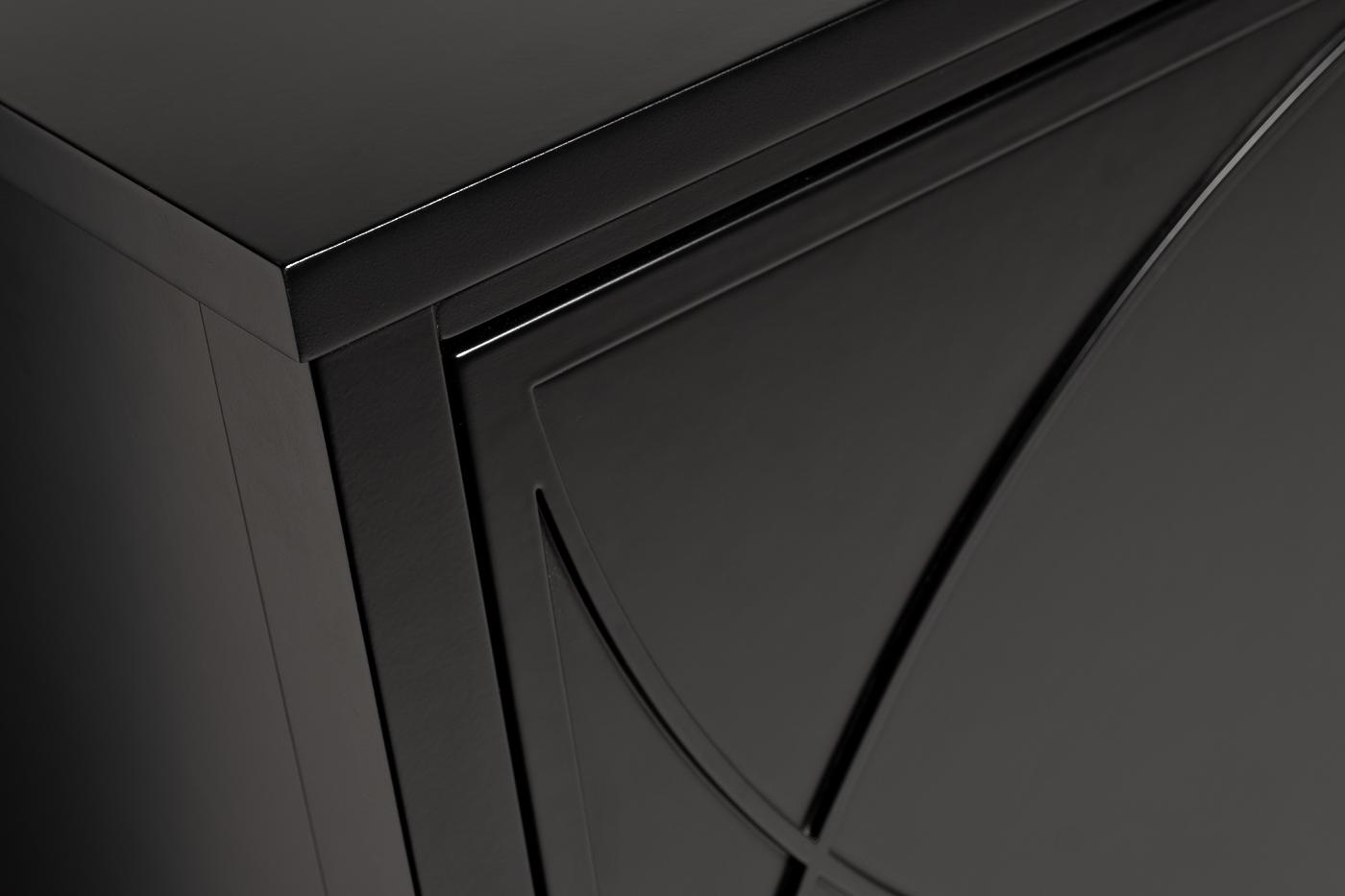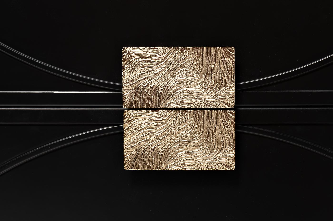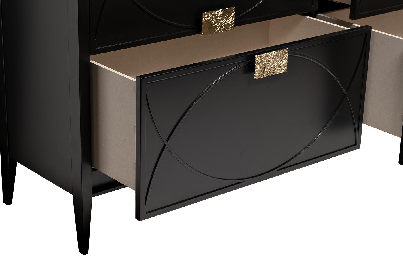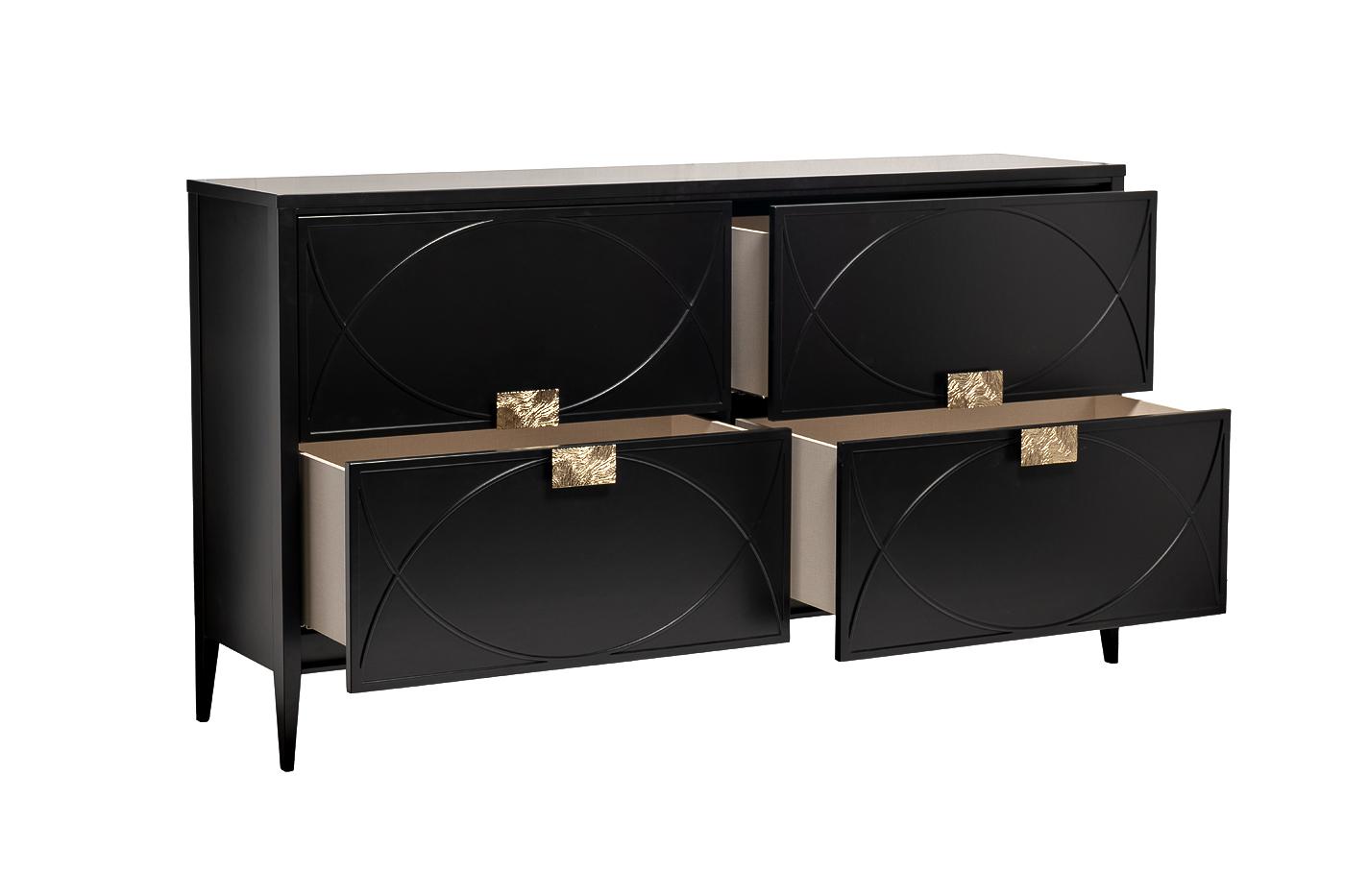 Дизайнерский комод в стиле ар-деко - авторская разработка дизайн-студии Garda Decor. Черный матовый фасад украшен объемным дугообразным декором и широкими рельефными ручками золотого цвета. Четыре выдвижных ящика прекрасно подойдут для хранения белья, оде...