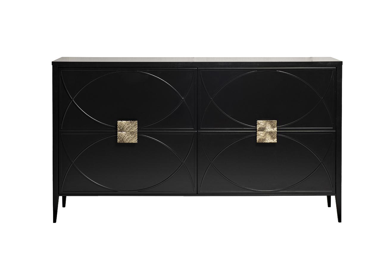 description-full - Дизайнерский комод в стиле ар-деко - авторская разработка дизайн-студии Garda Decor. Черный матовый фасад украшен объемным дугообразным декором и широкими рельефными ручками золотого цвета. Четыре выдвижных ящика прекрасно подойдут для хранения белья, одежды и прочих вещей. Тонкие ножки придают конструкции легкость и изящество. Эксклюзивный комод станет гармоничным дополнением интерьера спальни или гостиной. На нашем сайте представлены ТВ-тумба арт.98BP-GD01TUMB-CHERN, консоль арт.98BP-GD01KONS-CHERN и прикроватная тумбочка арт.98BP-GD02TUMB-CHERN из авторской коллекции Garda Decor для изысканной меблировки вашего дома в едином стиле.