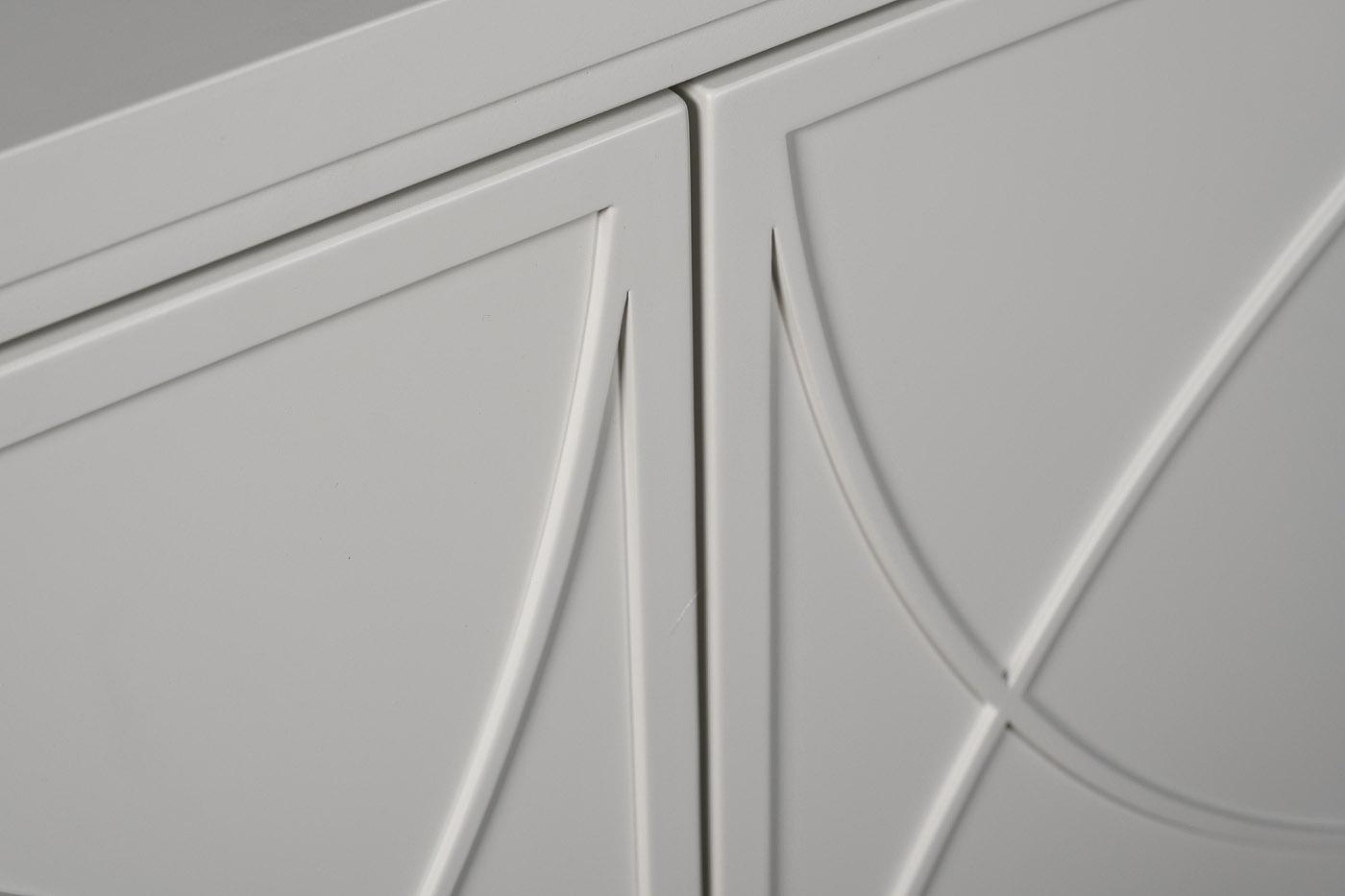 Дизайнерский комод в стиле ар-деко - авторская разработка дизайн-студии Garda Decor. Бежевый матовый фасад украшен объемным дугообразным декором и широкими рельефными ручками золотого цвета(матовое золото). Четыре выдвижных ящика прекрасно подойдут для хр...