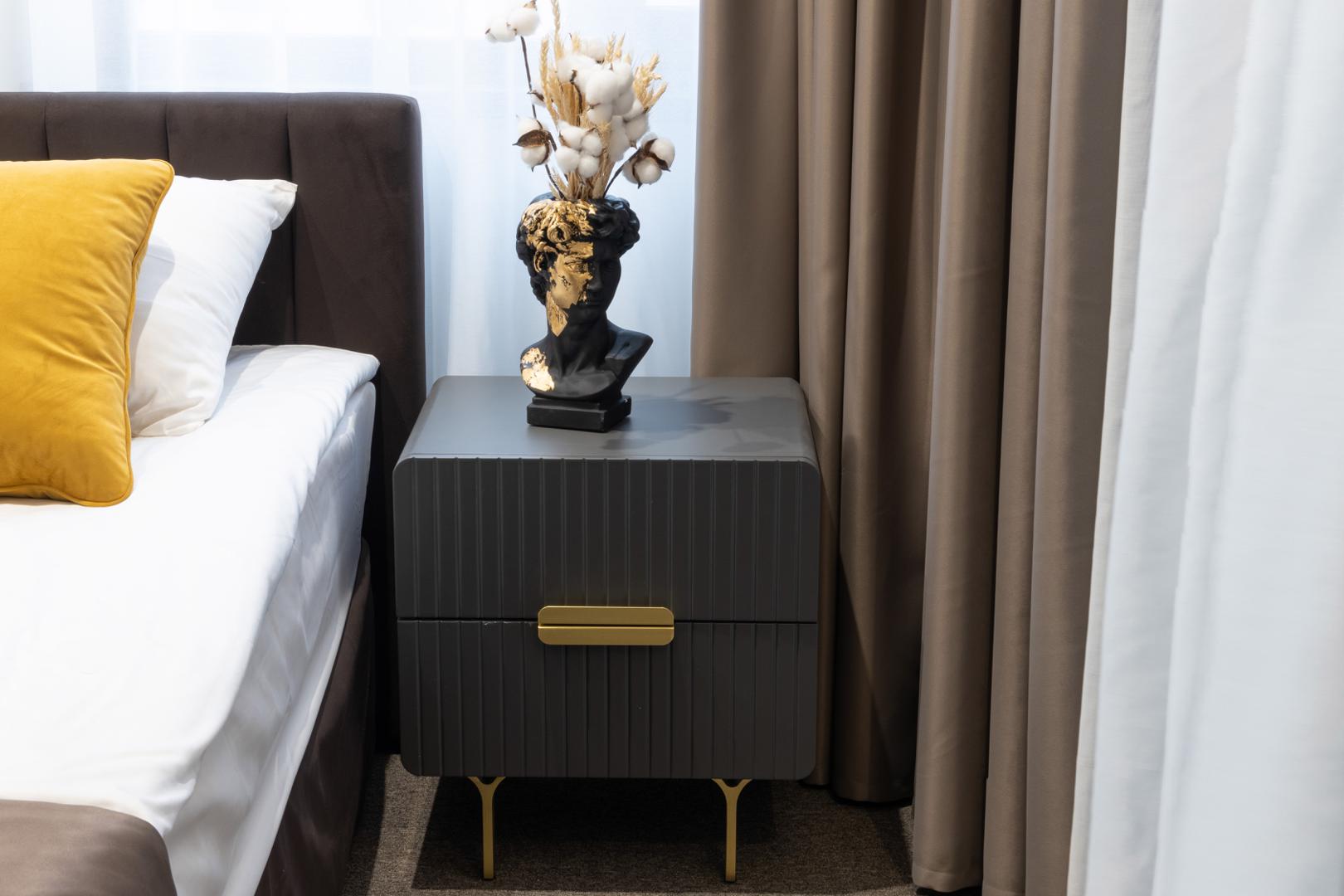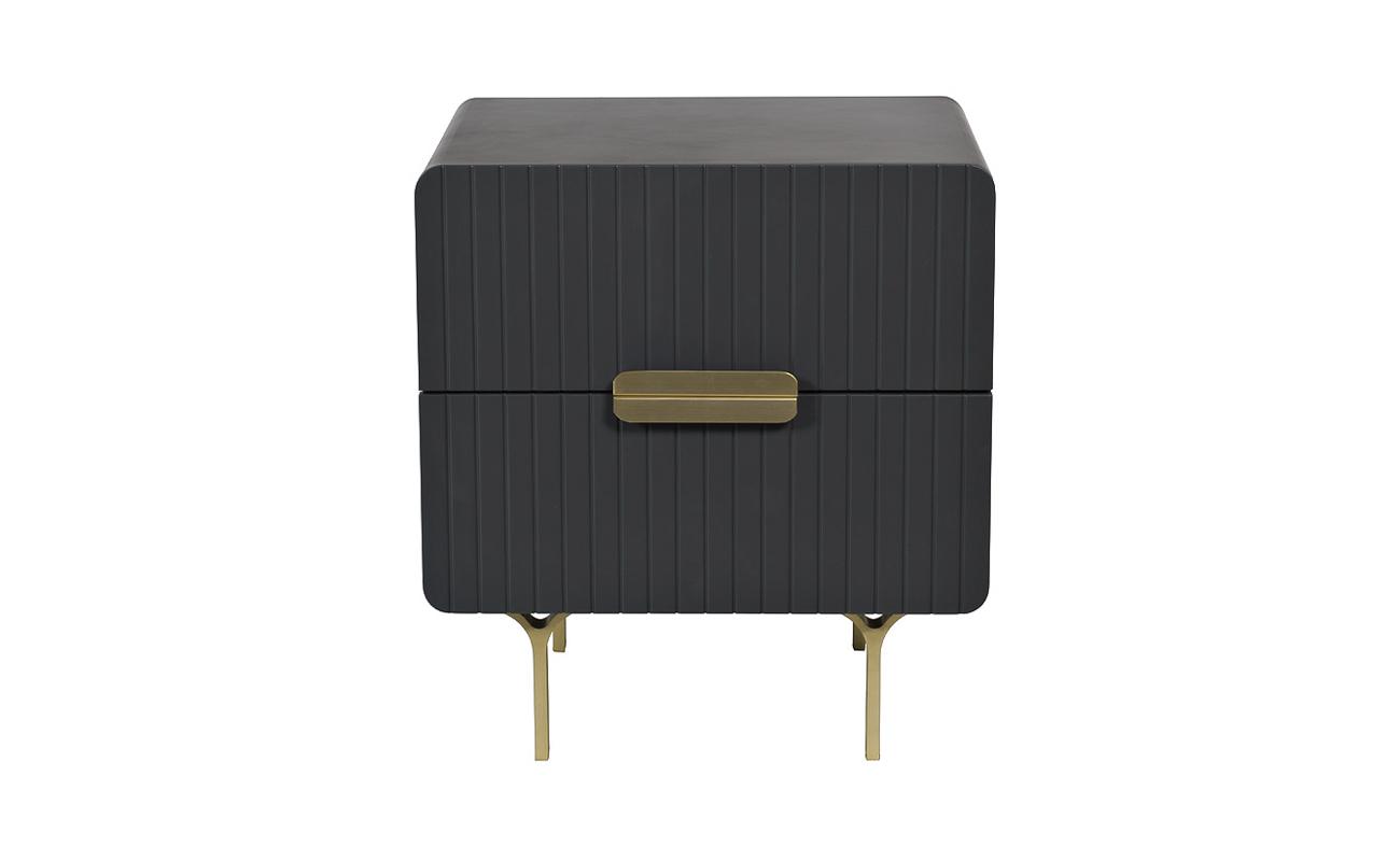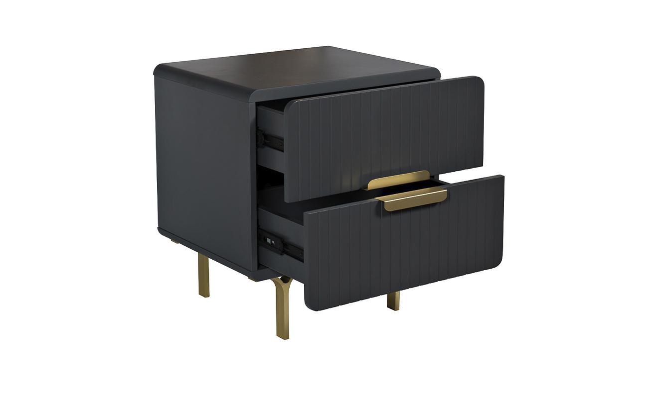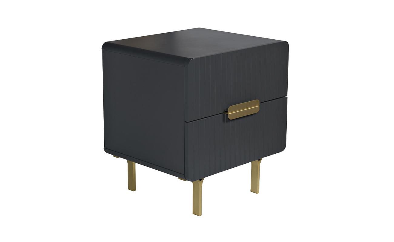 description-full - Серая тумбочка — стильное решение для оформления современного интерьера гостиной, спальни или кабинета. Модель будет органично смотреться как в большой гостиной, так и в помещении со скромным метражом. Изделие отличается не только презентабельным внешним видом, но и функциональностью, позволяя с максимальной пользой использовать свободное пространство. Тумбочка имеет два выдвижных ящика для хранения вещей. Фасад тумбочки выточен тонкими линиями и декорирован металлическими ручками латунного цвета, что придает ей некой изысканной футуристичности. В сочетании с ТВ-тумбой из этой же серии можно создать оформление в актуальных тенденциях интерьерного стиля. Сочетается с ТВ-тумбой 40AD-CB0006A.