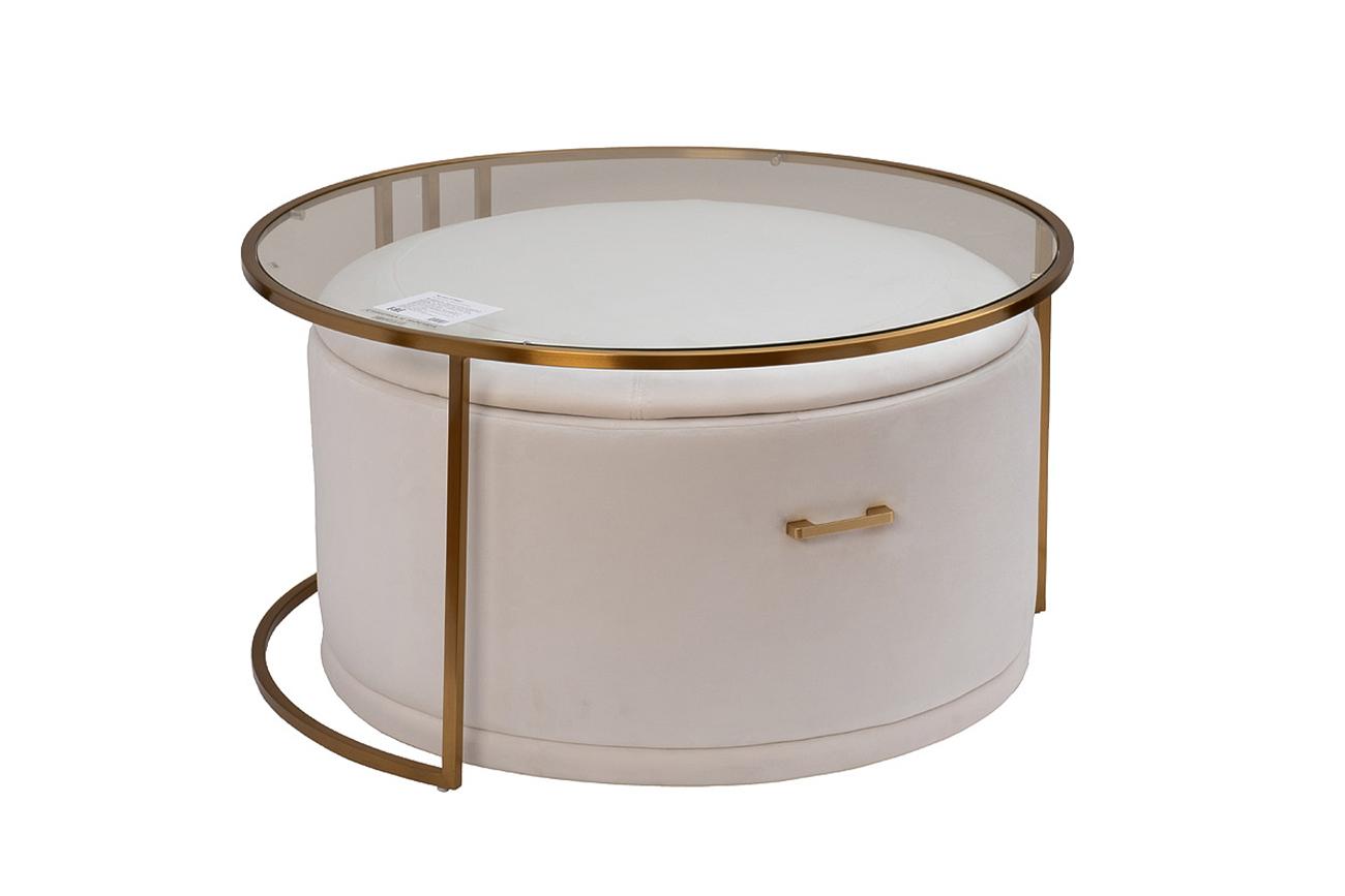 description-full - Журнальный стол с пуфом – интересная мебель с эффектным дизайном и расширенным функционалом. Круглый журнальный столик сочетает в себе надежный каркас из блестящей нержавеющей стали и прозрачную столешницу из закаленного стекла. Он составит отличную компанию диванам и креслам, станет эффектным дополнением к обстановке гостиной. Мягкий светлый пуф из велюра является не только дополнительным местом для сидения, но и удобным способом хранения вещей за счет внутреннего пространства. Дизайнерский комплект мебели выглядит стильно и изысканно, легко вписывается в интерьеры ар-деко, неоклассика, модерн. .