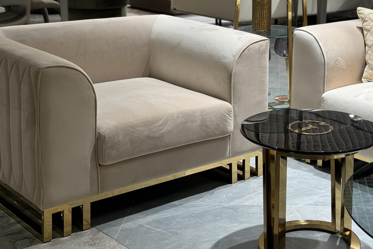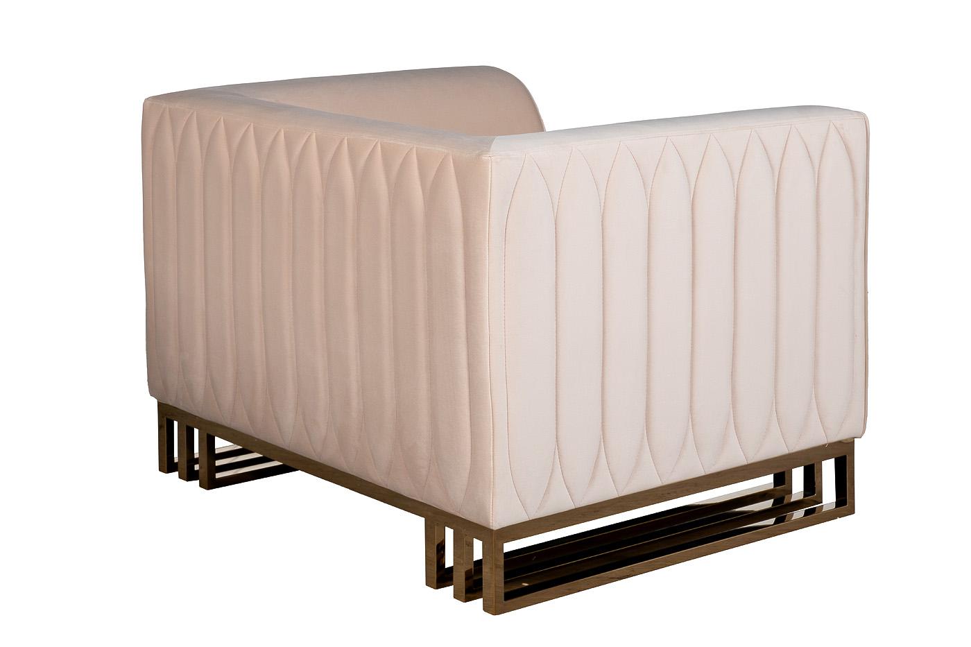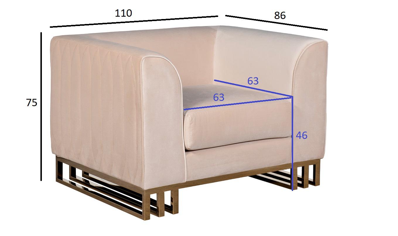 description-full - Кресло Люцерн (Lucerne) отличается кубическим силуэтом, но при этом не выглядит громоздко за счет того, что нижняя часть приподнята на основании из металлического профиля. Внешняя часть декорирована прострочкой по приятному бежевому велюру, основание выполнено из нерж.стали с глянцевым золотым покрытием. Габариты сиденья: ширина 63см, глубина 63см, высота от пола 46см. Сочетается с трехместным диваном 102AN-20493