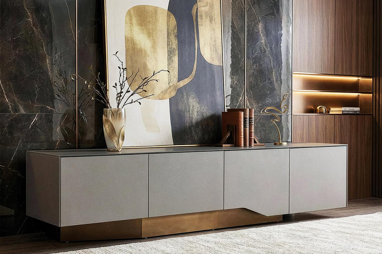 description-full - Стильная тумба под телевизор из МДФ, стекла и металла станет изысканным акцентом в современном интерьере. Лаконичный дизайн, основанный на игре фактур и контрасте серого и бронзового цветов, придает модели особый шарм. Тумба под телевизор с выдвижными ящиками — не только стильный, но и практичный предмет интерьера. Вместительные отделения скрывают от посторонних глаз необходимые вещи. Модель органично впишется в обстановку, оформленную в стилистике неоклассики, минимализма или ар-деко.