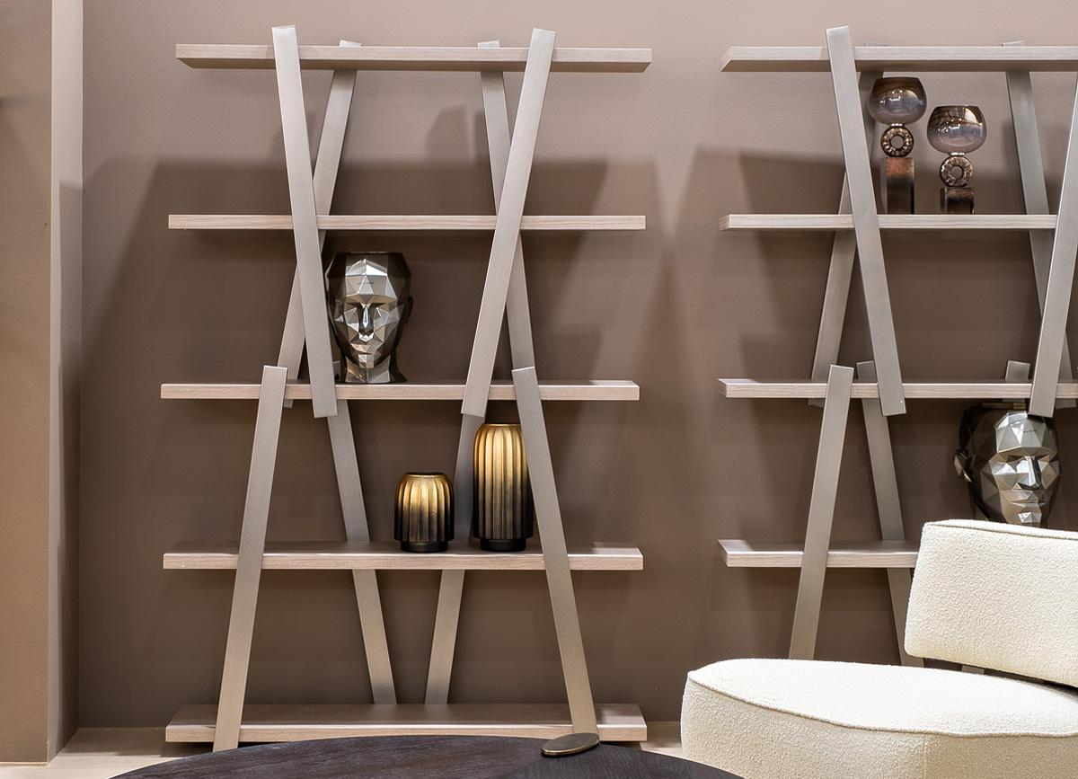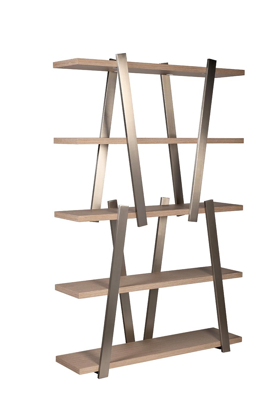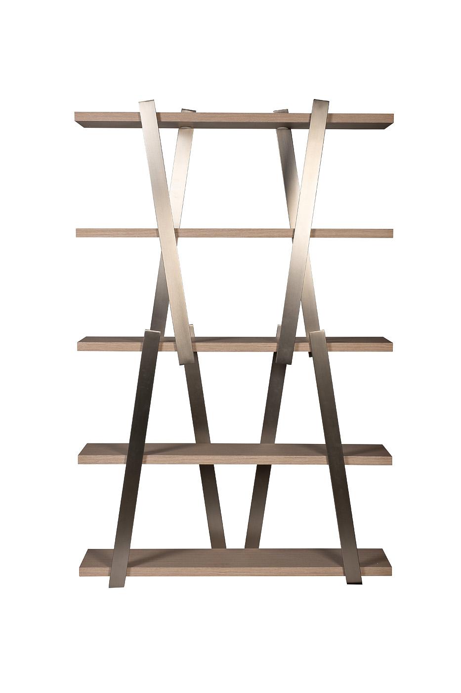 description-full - Оригинальный стеллаж с полками из МДФ, отделанного светлым шпоном, станет прекрасным дополнением современной гостиной, кабинета или библиотеки. Необычный дизайн, в котором деревянные полки соединены перекрещивающимися металлическими опорами цвета античной бронзы, приковывает взгляд и делает стеллаж похожим на арт-объект. Стеллаж прекрасно подойдет для размещения книг, фотографий, а также предметов декора.