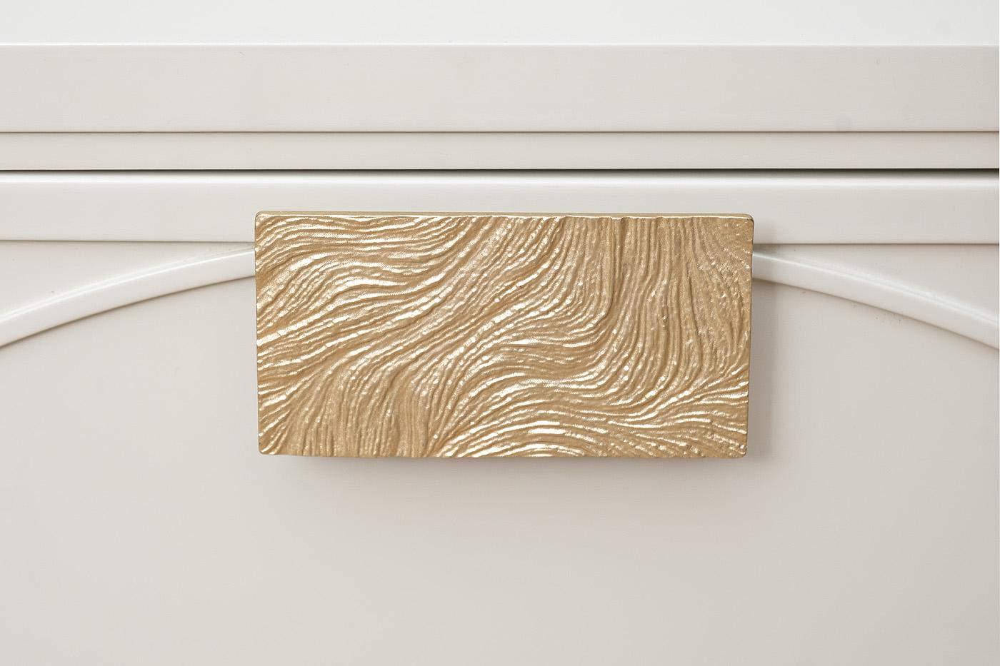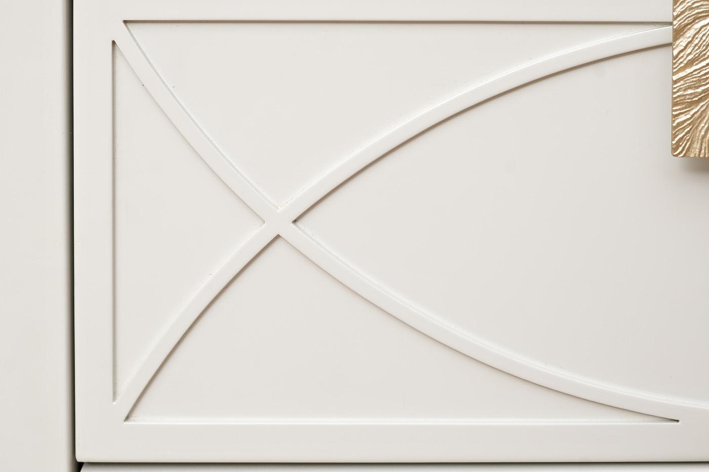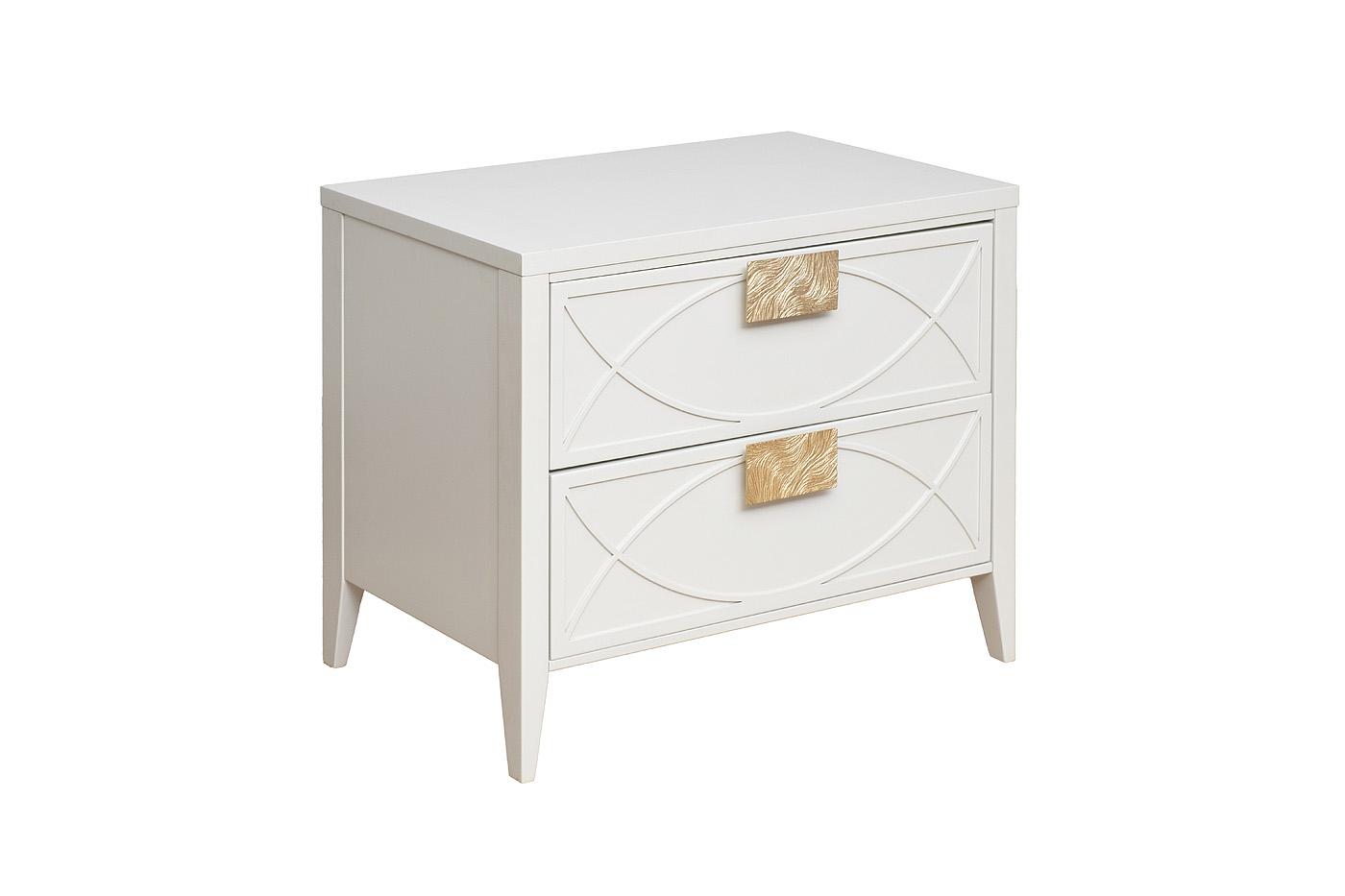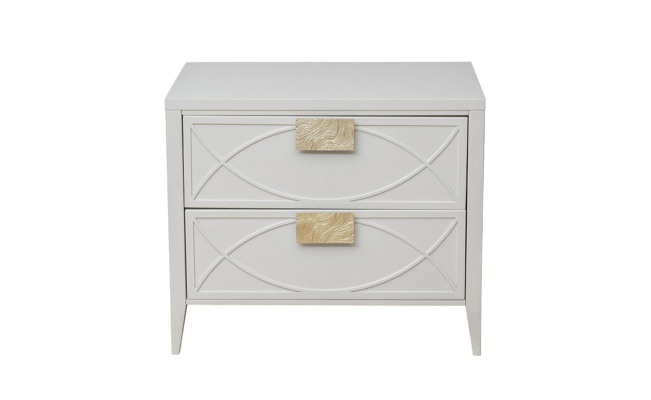 Дизайнерская тумбочка в стиле ар-деко - авторская разработка студии Garda Decor. Бежевый матовый фасад украшен объемным дугообразным декором и широкими рельефными ручками золотого цвета (матовое золото). Два выдвижных ящика прекрасно подойдут для домашней...