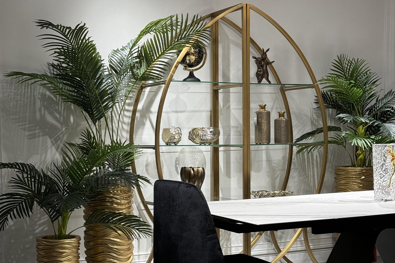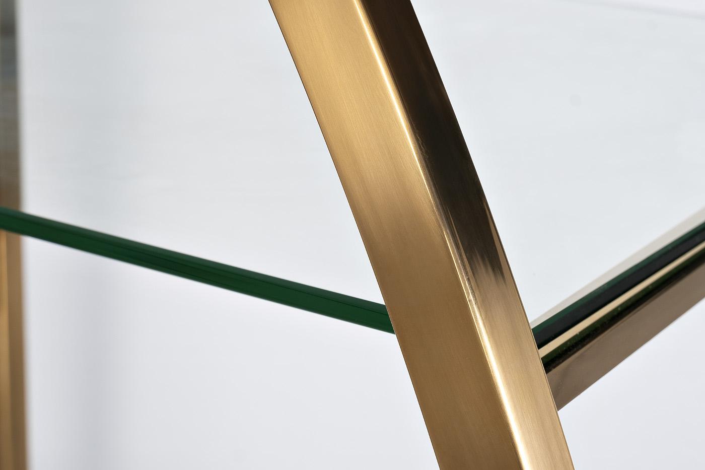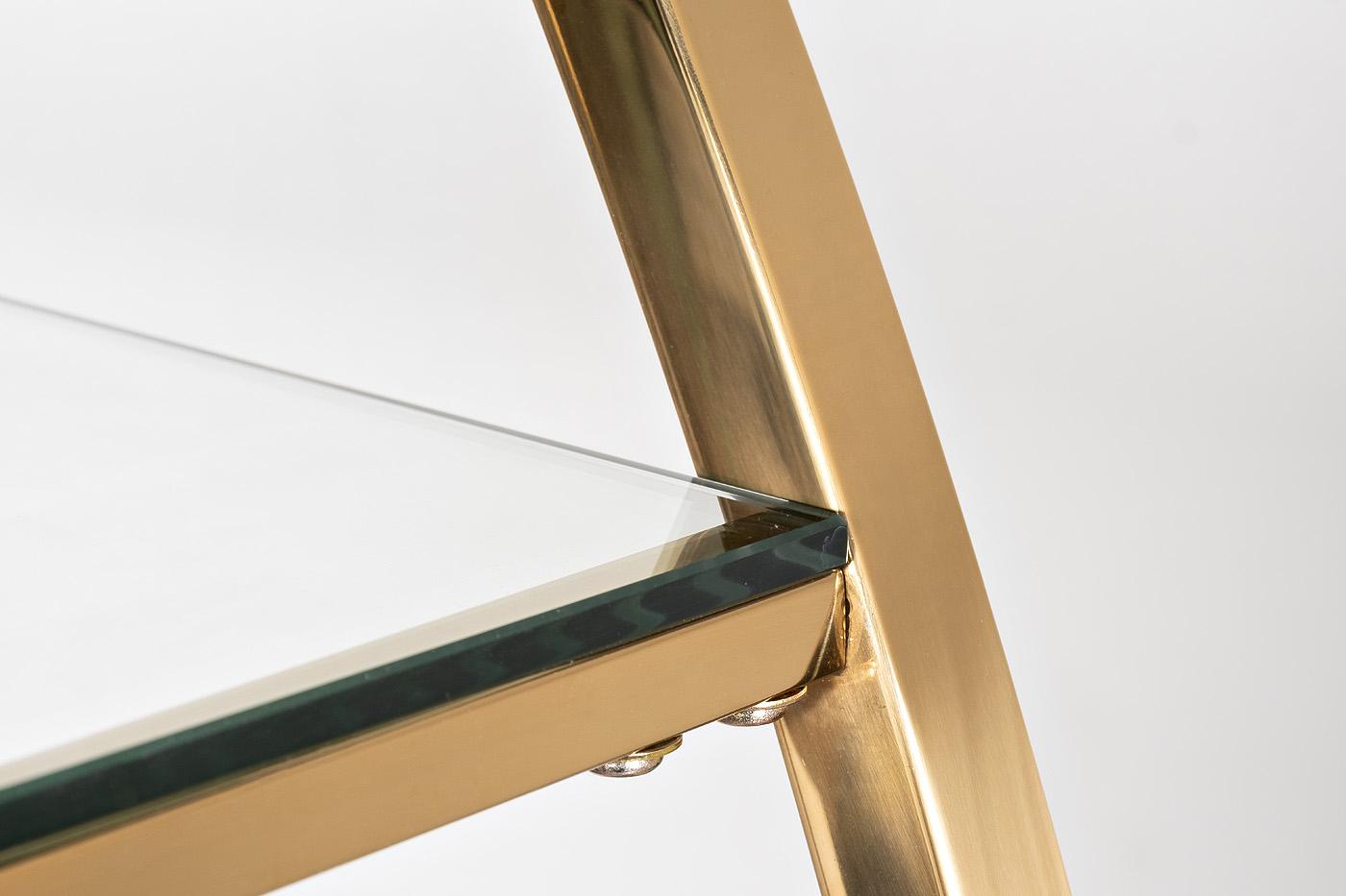 description-full - Дизайнерский стеллаж в гостиную "ПОЛУСФЕРА" сочетает в себе креативный стиль и функциональность. Он прекрасно справится с хранением сувениров, посуды, книг, статуэток и прочего домашнего декора. Стеклянные полки станут идеальным местом для ваз, кашпо, фоторамок, шкатулок, памятных вещей. Стильный стеллаж из стали золотого цвета необычной формы украсит интерьер гостиной, спальни, столовой, рабочего кабинета. За счет тандема блестящей стали и прозрачного стекла он добавит обстановке изящества и не перегрузит интерьер. Купить стеллаж с полками можно для украшения дома или квартиры в современном стиле. Он легко сочетается с мебелью в стиле ар-деко, неоклассики, контемпорари.