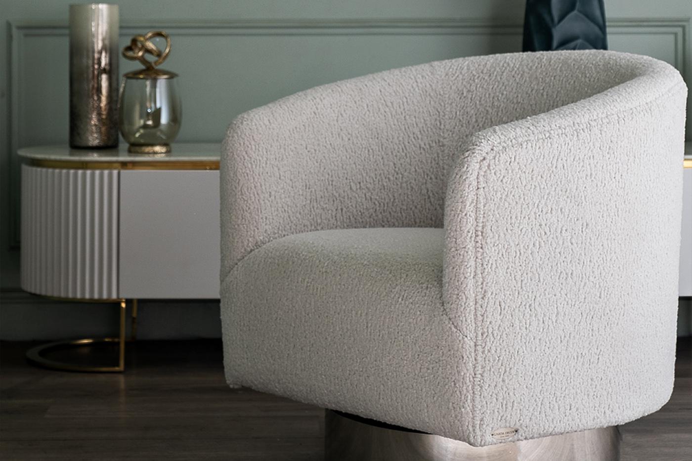 description-full - Оригинальное вращающееся кресло в стиле ар-деко — трендовая модель мягкой мебели, которая станет стильным дополнением гостиной, спальни, салона красоты. Круглая широкая ножка с механизмом вращения выполнена из нержавеющей стали. Она придает изделию завершенности. Вращающееся мягкое кресло в обивке из искусственного каракуля в нежном сером оттенке позволит уютно в нем расположиться, расслабив тело и ощутив максимальный комфорт. В каталоге бренда Garda Decor представлено мягкое серое кресло с обивкой из искусственного каракуля, деревянным каркасом и металлическим основанием. Габариты сиденья: ширина 54см, глубина 54см, высота от пола 46см.
