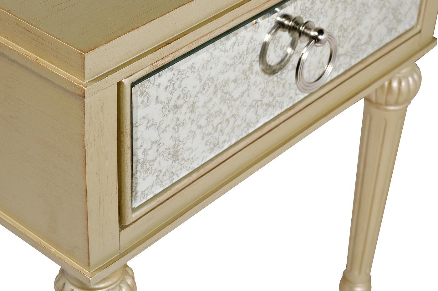 description-full - Элегантная тумба с изящными точеными ножками и выдвижным ящиком, отделанная искусственно состаренным зеркалом цвета antique silver, украсит вашу спальную комнату, кабинет или гостиную. Она не занимает много места, поэтому подойдет даже для небольшого помещения. Оригинальная тумба превращает спальню в изысканный будуар, а прихожую - в аристократичный холл. Тумба составит элегантный ансамбль с консолью схожего дизайна арт. KFG1508.