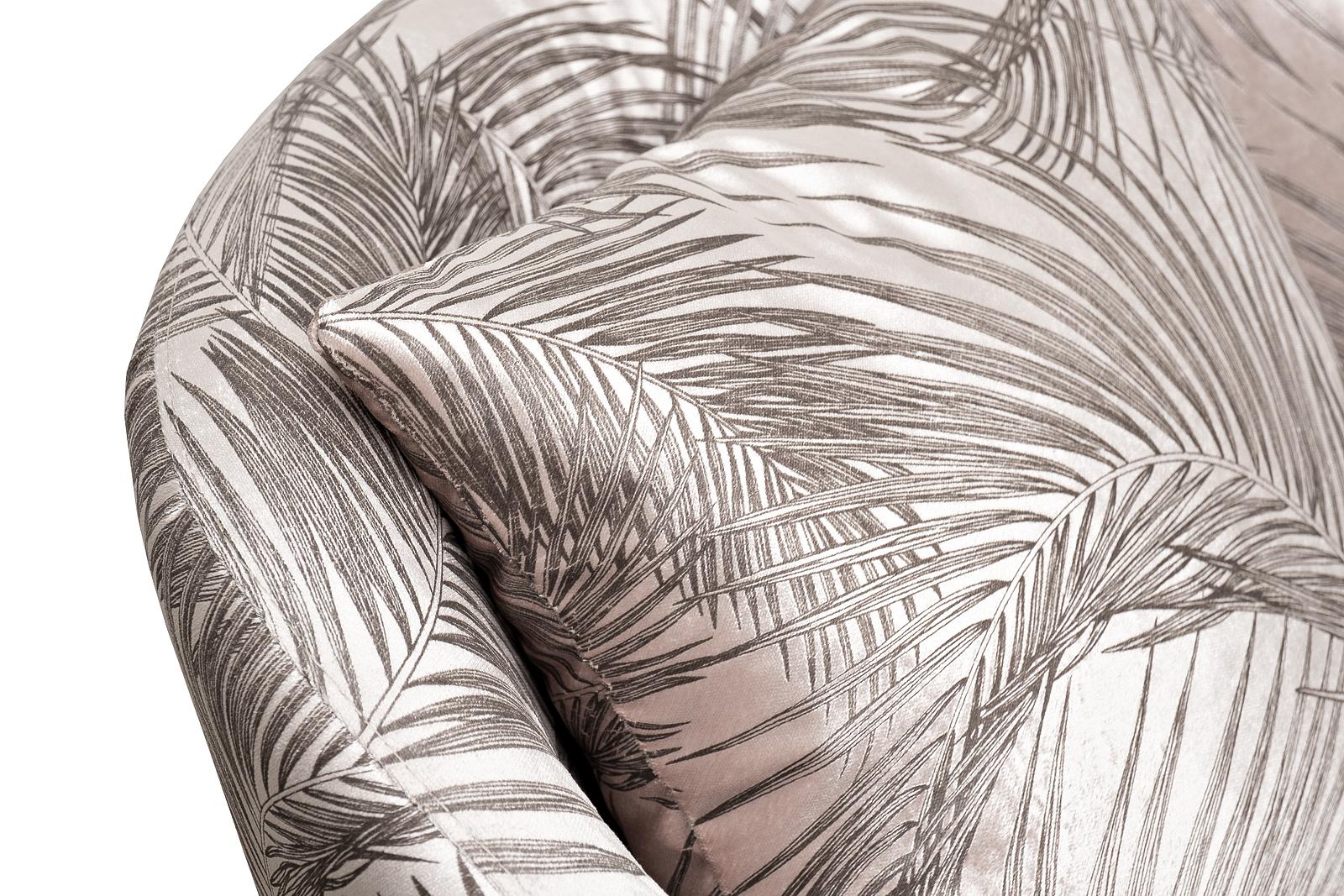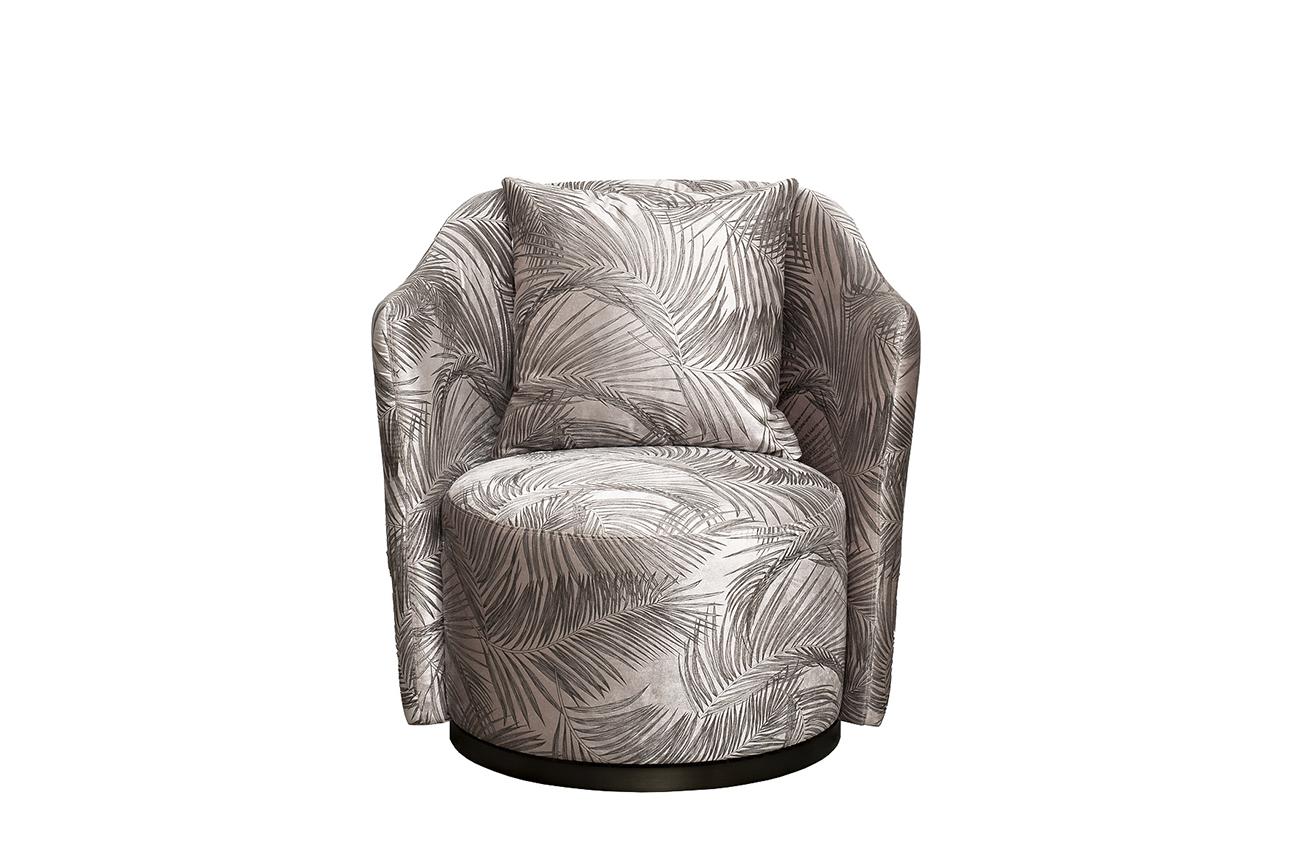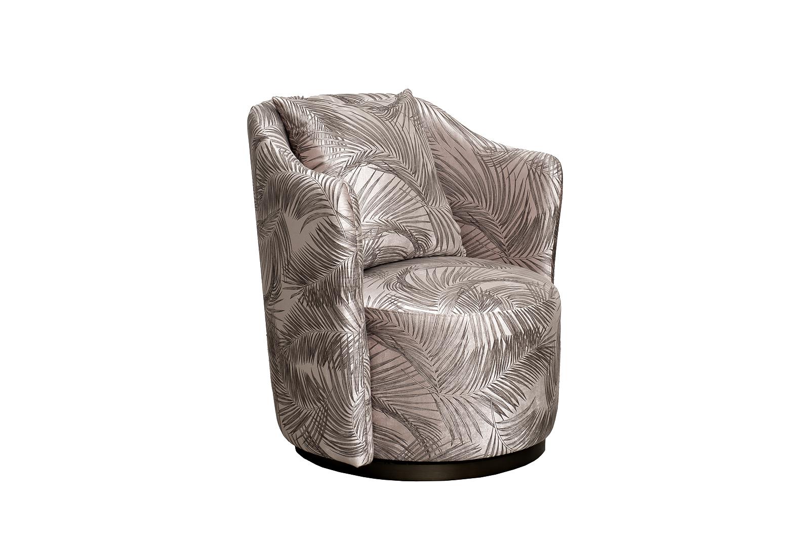description-full - Красивое вращающееся кресло Верона(Verona) идеально подойдет для современного интерьера, в котором важную роль играет эксклюзивность и высокое качество мебели. За счет надежного механизма сидение легко вращается, делая кресло мобильным и удобным как для отдыха, так и для работы. Классическая эргономичная форма, спинка с подлокотниками, мягкая подушка делает дизайнерское кресло с принтом «пальмовые листья» отличным выбором для гостиной, спальни, холла. Оно будет эффектно смотреться в жилых интерьерах ар-деко, неоклассика, фьюжн, шебби-шик, контемпорари. Размер сиденья Г58*Ш60*В40см.Диаметр металлической части основания - 58см, высота - 3,5см. В стандартном исполнении: обивка - ткань вельвет из коллекции Garda Decor с дизайнерским принтом листья Вальдес-БЕЖ(Valdes110-BEG), металлическое основание, цвет бронза.