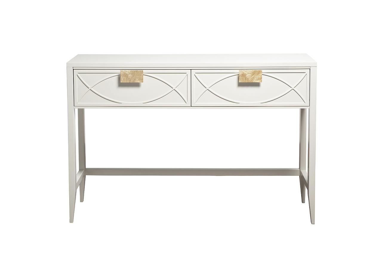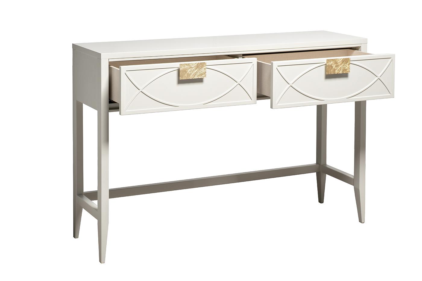 Дизайнерская консоль в стиле ар-деко - авторская разработка студии Garda Decor. Бежевый матовый фасад украшен объемным дугообразным декором и широкими рельефными ручками цвета матовое золото. Два выдвижных ящика прекрасно подойдут для хранения щеток, косм...