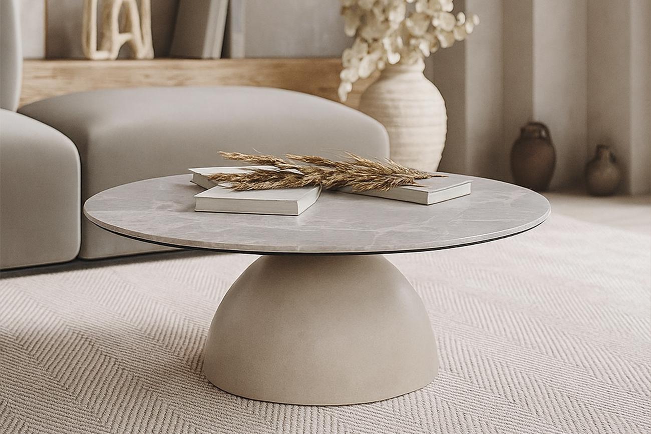 description-full - Этот журнальный стол — яркий пример того, как функциональность сливается с формой, создавая скульптурный минимализм. Его круглая столешница выполнена из керамики в оттенках серого, имитирующем благородный камень. Покрытие из закаленного стекла устойчиво к повседневному износу и не требует сложного ухода, сочетая эстетику керамики с практичностью. Конструкция стола отличается основательностью: столешница будто балансирует на мощном монолитном основании, что создает эффектную скульптурную форму. Дизайн круглого керамического стола соответствует самым актуальным трендам, где доминируют плавные линии и природные материалы. Это идеальный дизайнерский журнальный стол для современной гостиной или лаунж-зоны, привносящий ощущение утонченной роскоши и завершенности. Он станет сильным фокусом в пространстве, говорящим о внимании к деталям и хорошем вкусе. Толщина столешницы - 7мм (3мм керамика и 4мм закаленное стекло). Сочетается с журнальным столом 57EL-17012.