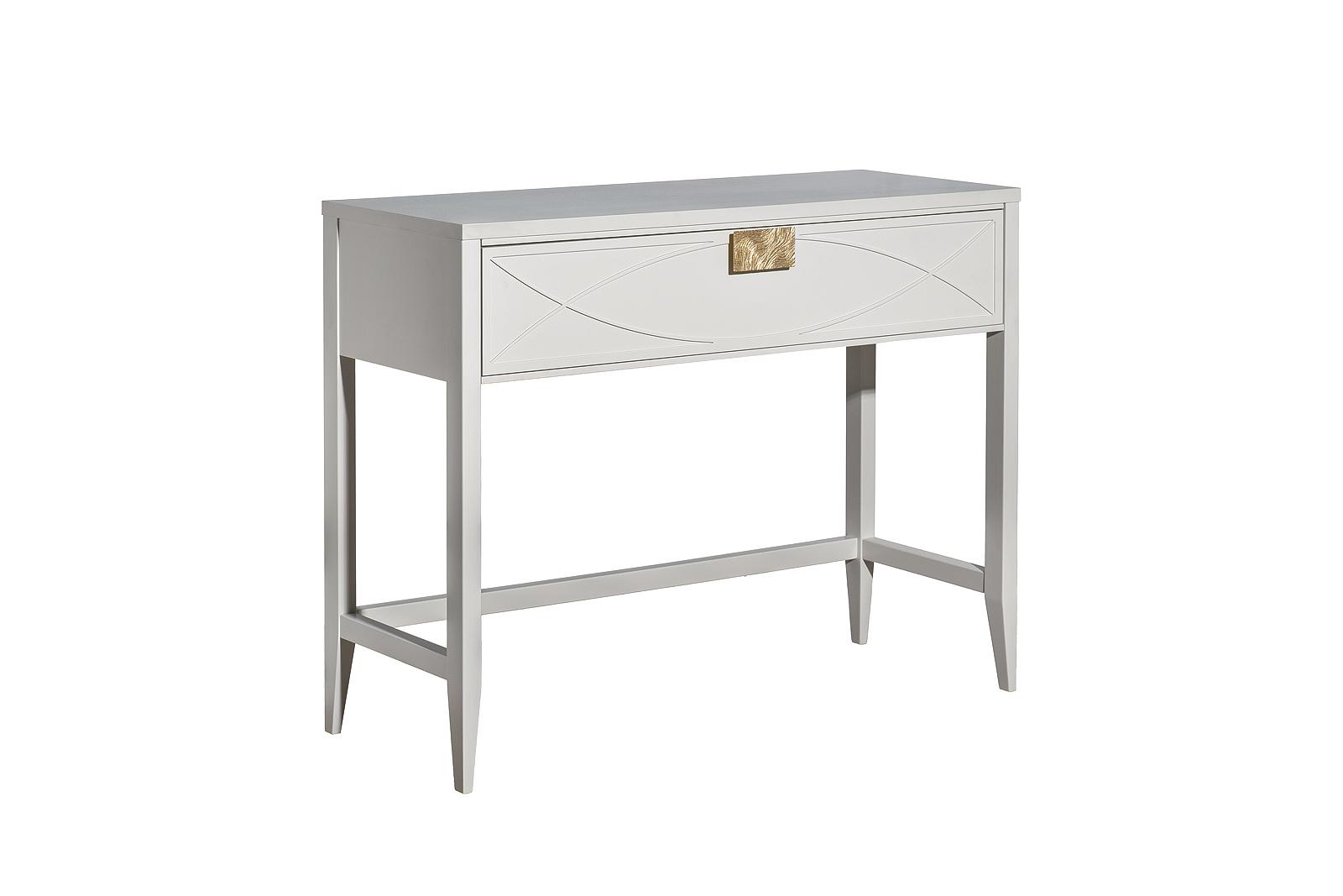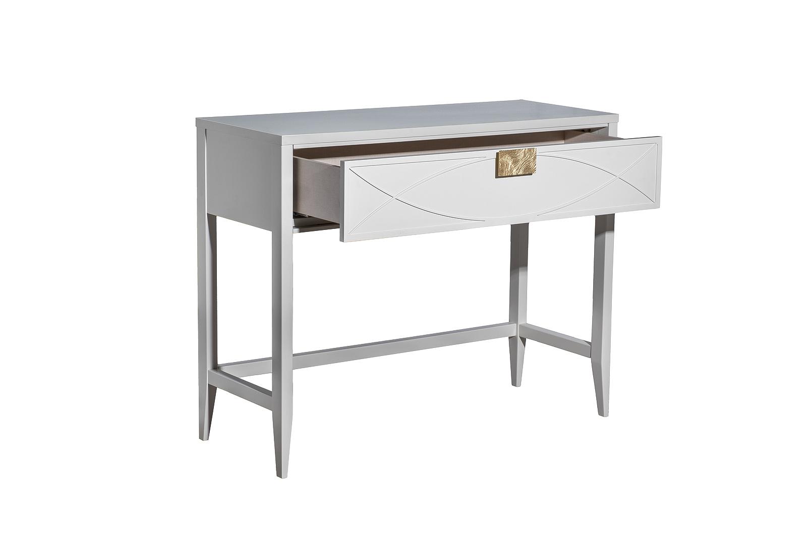 Дизайнерская консоль в стиле ар-деко - авторская разработка студии Garda Decor. Бежевый матовый фасад украшен объемным дугообразным декором и широкими рельефными ручками цвета матовое золото. Выдвижной ящик прекрасно подойдет для хранения щеток, косметики...