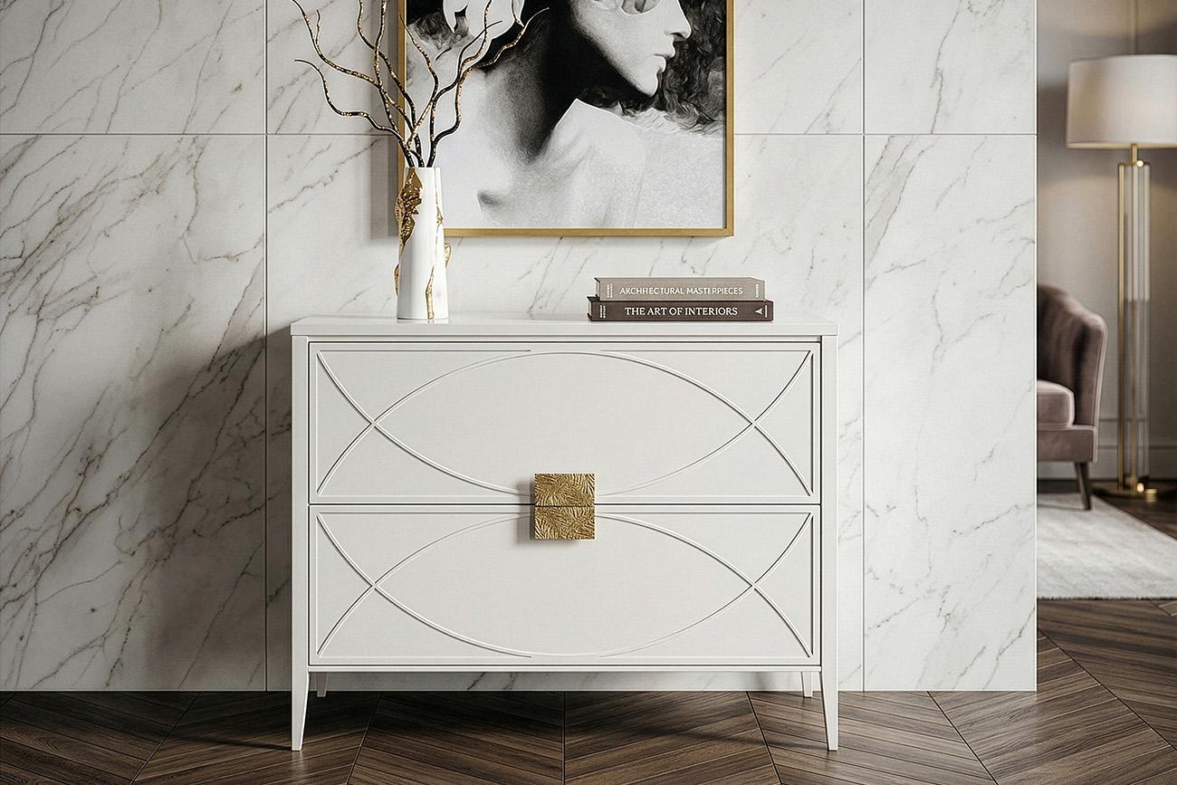 Дизайнерский комод в стиле ар-деко - авторская разработка дизайн-студии Garda Decor. Бежевый матовый фасад украшен объемным дугообразным декором и широкими рельефными ручками золотого цвета(матовое золото). Два выдвижных ящика прекрасно подойдут для хране...