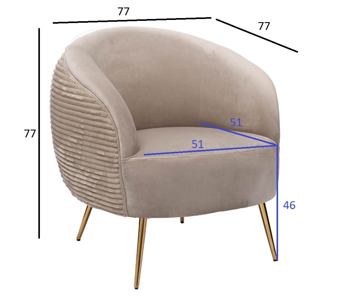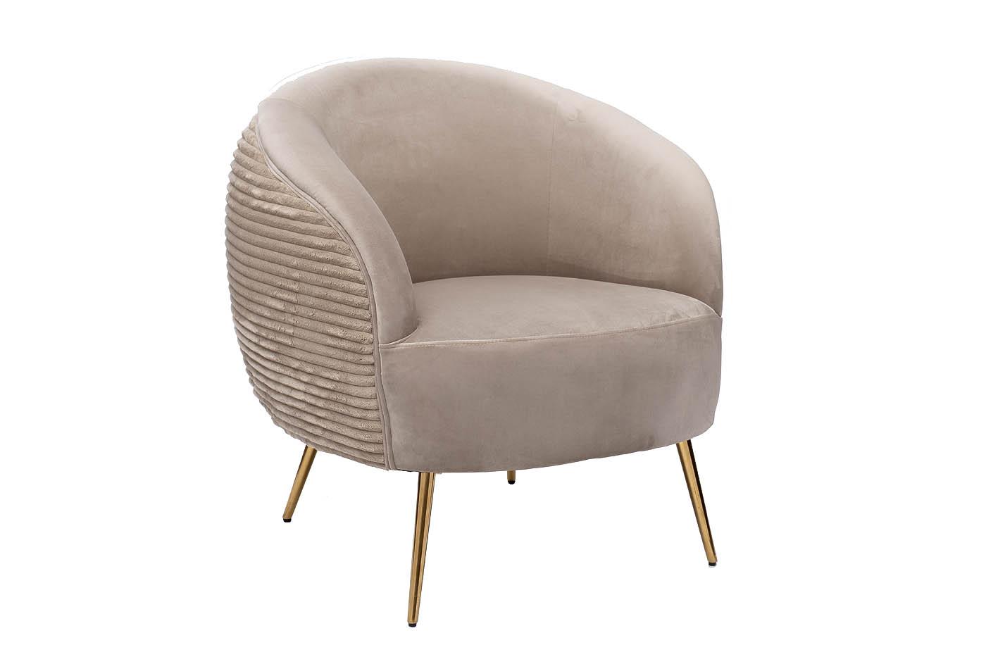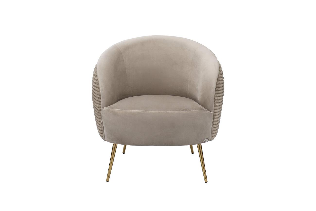 description-full - Комфортное велюровое кресло эффектно смотрится в современном интерьере ар-деко и является идеальным для отдыха. Оно найдет себе место в гостиной, спальне, кабинете, лаунж-зоне – в любом стильном пространстве. За счет мягкой обтекаемой спинки, плавно переходящей в подлокотники, дутое кресло обеспечивает максимальный комфорт и эффект «утопания». Каркас из дерева обеспечивает модели надежность и устойчивость, а позолоченные ножки из металла в стиле 50-х добавляют изящности. Бежевое кресло с обивкой из мягкого дорогого велюра составит стильную компанию дивану в аналогичной стилистике. Габариты сиденья: ширина - 51см, глубина - 51см, высота сиденья - 46см