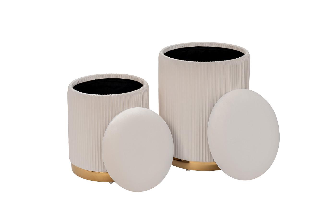 description-full - Элегантные велюровые пуфы украсят собой обстановку современной гостиной, спальни, прихожей. Такой стильный набор мягких пуфов добавит домашнего уюта и станет отличным местом для хранения вещей благодаря внутренним отсекам. Яркой особенностью комплекта является декоративное основание из позолоченной нержавеющей стали. Оно придает пуфикам элегантности и легкости. В качестве обивки используется дорогой качественный велюр, устойчивый к истиранию. Он легко чистится современными средствами. На сайте компании Garda Decor представлены как круглые пуфы, так и прямоугольные – различных размеров и дизайна. Банкетка велюровая светло-бежевого цвета ( 2 в 1) d35,5*35,5*49см и 31*31*43см с основанием цвета золото.