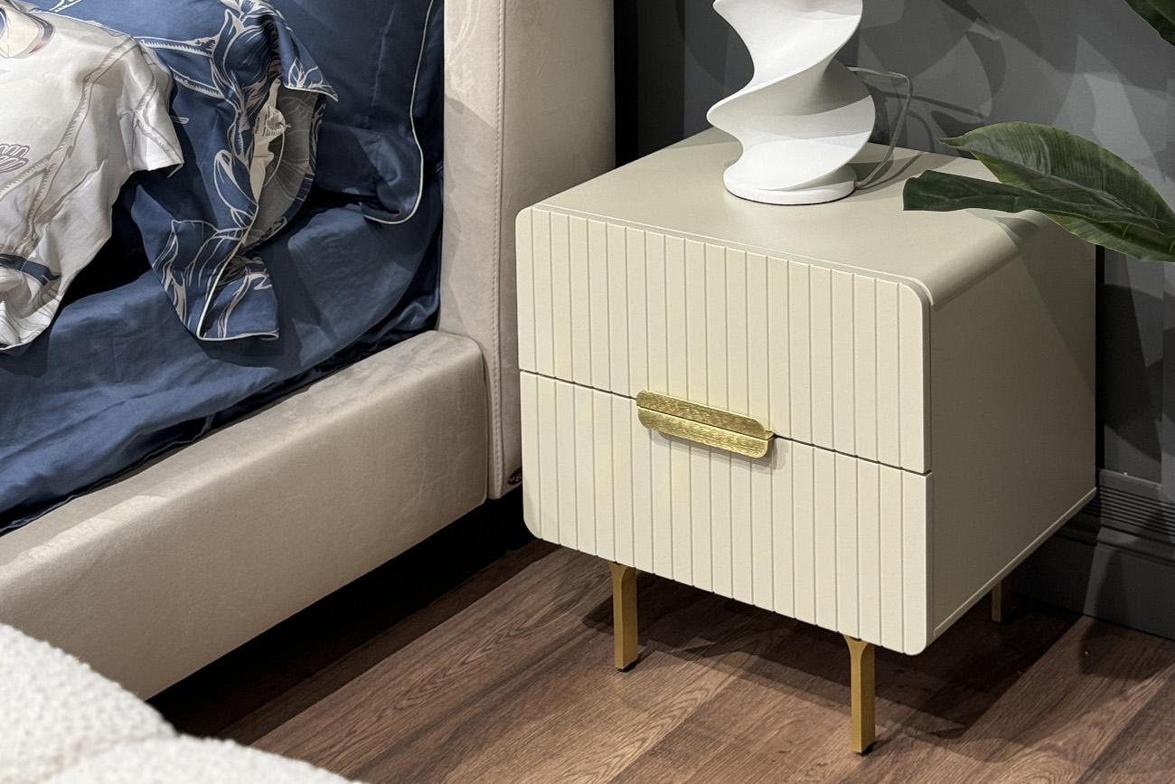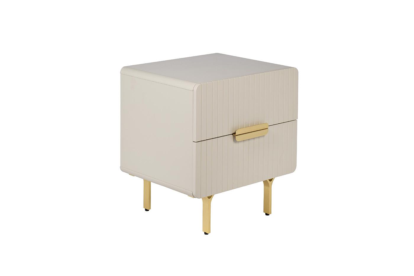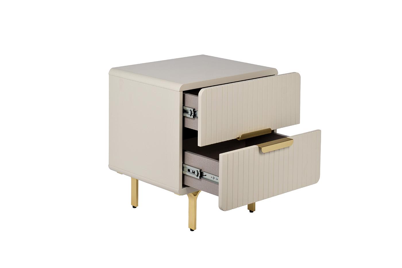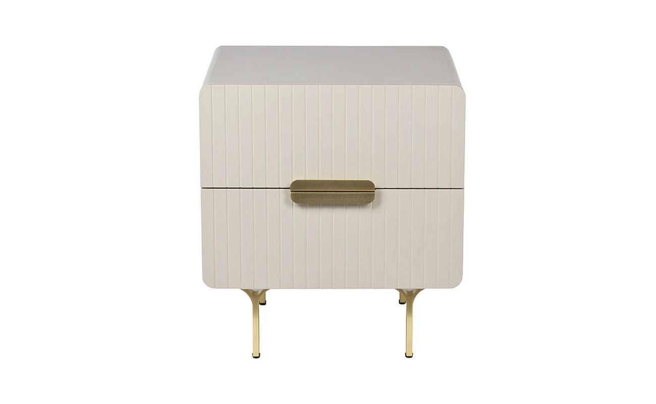 description-full - Тумбочка в светло-бежевом оттенке подходит для современных интерьеров и сможет гармонично вписаться в любое помещение за счет своих небольших размеров и аккуратной формы. Обтекаемые формы, тонкие ножки и минималистичные ручки на двух выдвижных ящиках делают изделие достойным представителем трендовой мебели. Качественный МДФ, из которого выполнен фасад изделия, обеспечивает долгую эксплуатацию. Благородства и стиля изделию придают металлические элементы в золотом оттенке.