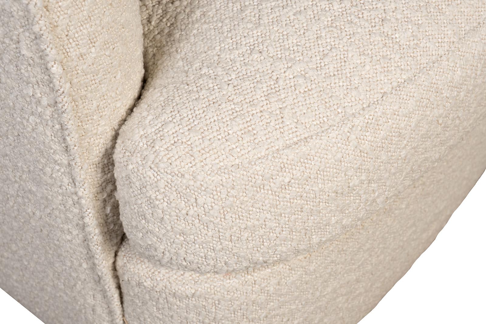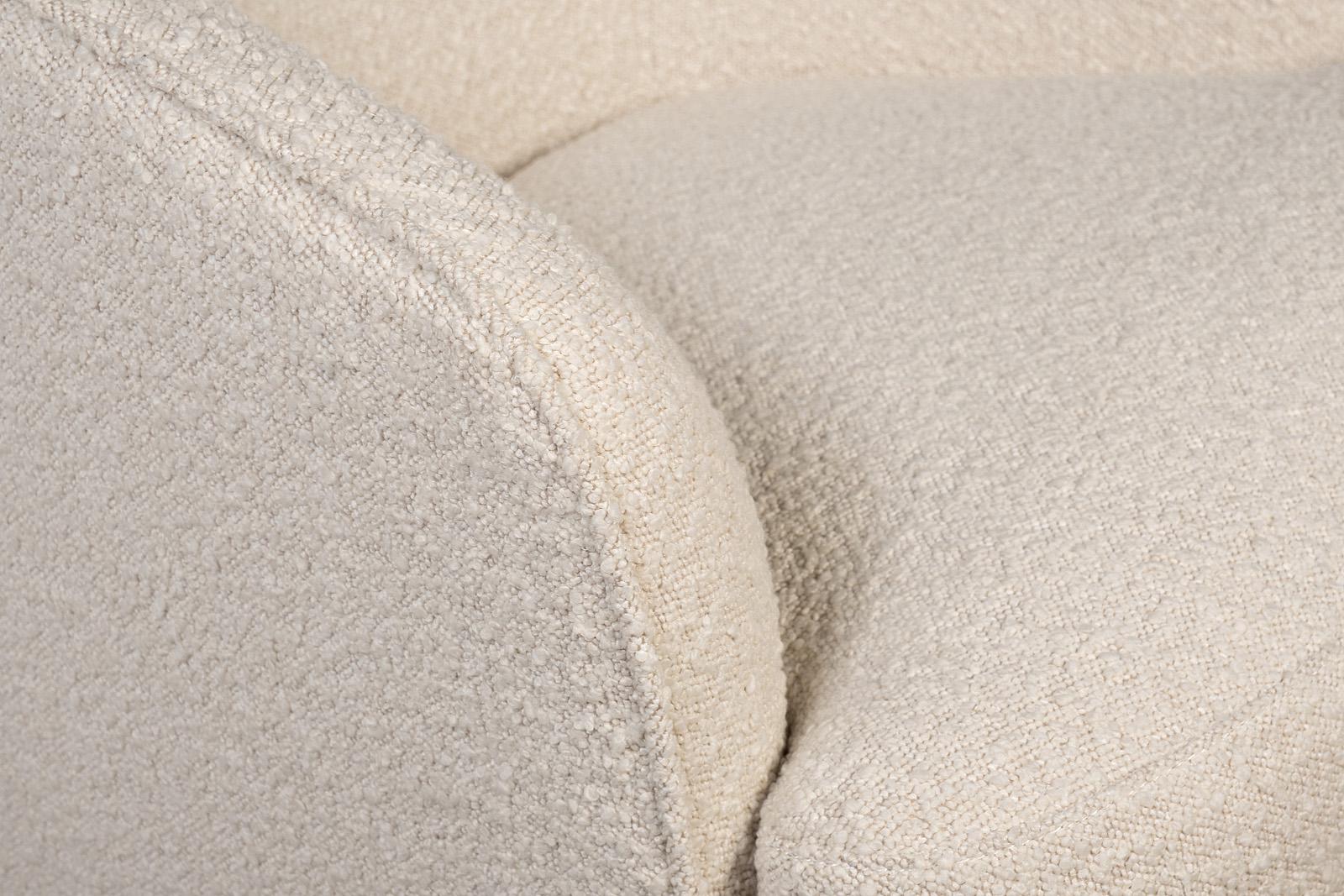 Поворотное кресло в обивке из бежевого букле — квинтэссенция мягкой архитектуры и уюта. Сдержанная округлая форма словно нарисована одной уверенной линией: спинка перетекает в подлокотники, создавая обволакивающий комфорт. Обивка из модного букле с тактил...