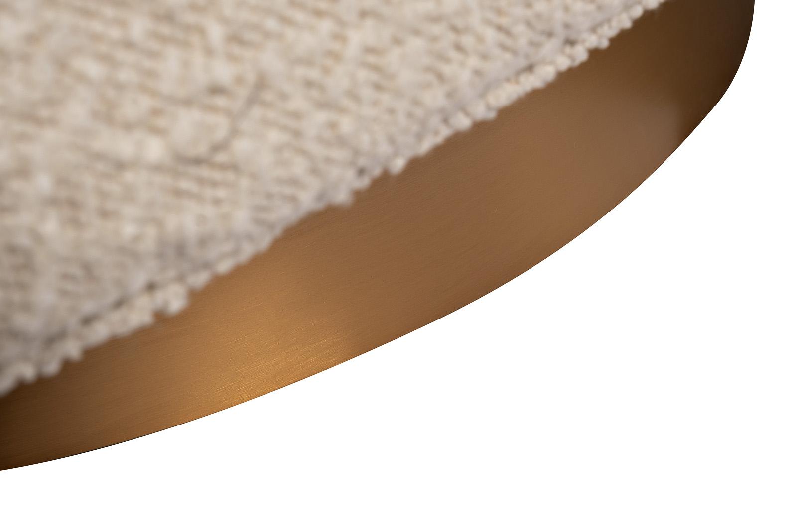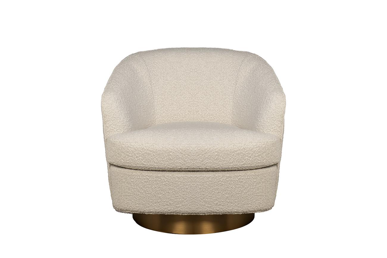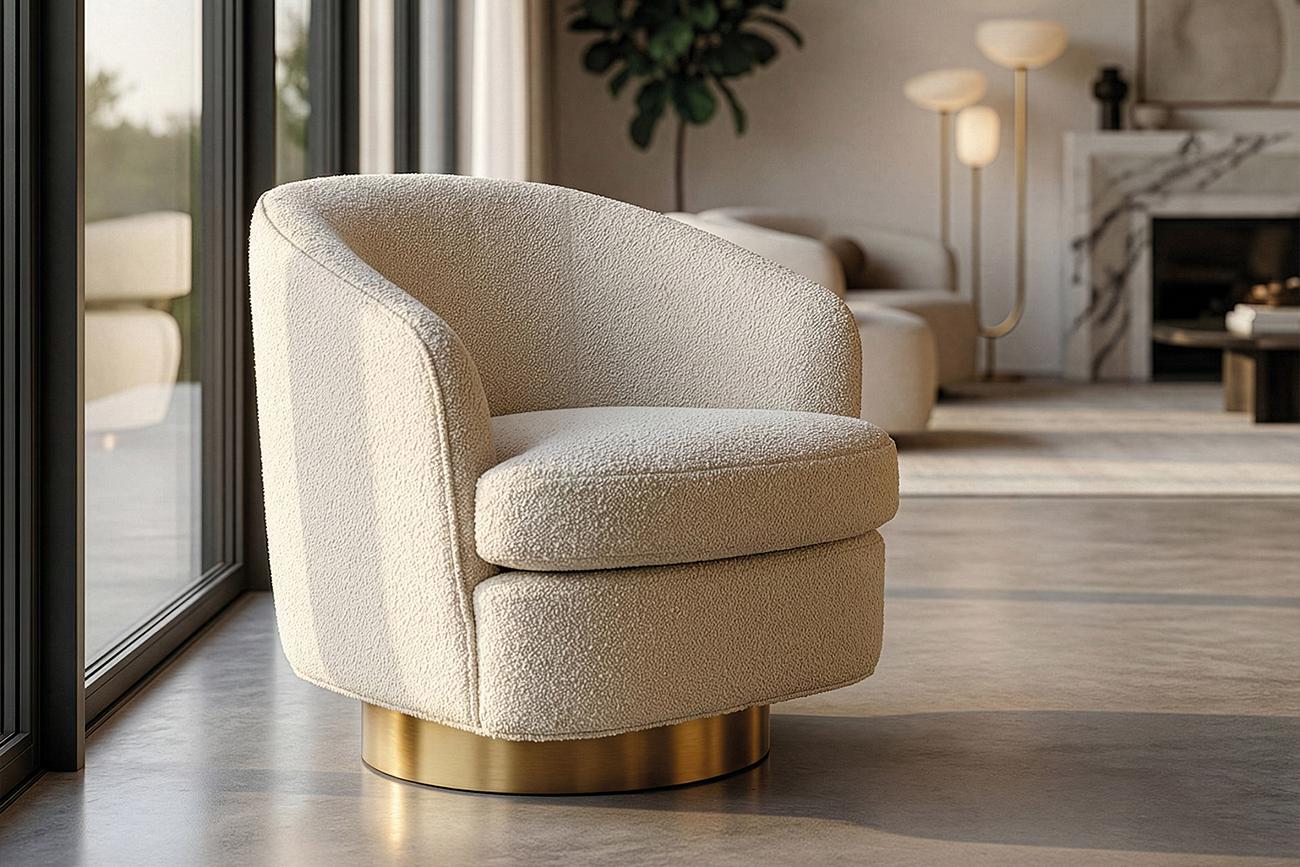 description-full - Поворотное кресло в обивке из бежевого букле — квинтэссенция мягкой архитектуры и уюта. Сдержанная округлая форма словно нарисована одной уверенной линией: спинка перетекает в подлокотники, создавая обволакивающий комфорт. Обивка из модного букле с тактильной текстурой и легким световым зерном придаёт изделию глубину и визуальную мягкость. Основание из матового золота добавляет акцент благородства. Это не просто кресло — это интерьерный жест: для уголка чтения, у изножья кровати или в просторной гостиной. Стильный акцент для тех, кто ищет не просто мягкую мебель, а предмет с характером.