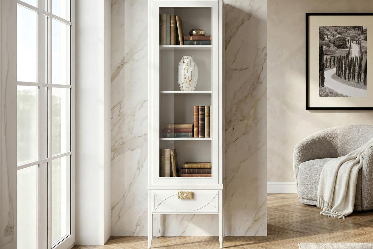 Шкаф-витрина со стеклянным фасадом — изящная вертикаль для столовой или гостиной, где каждый элемент служит уюту. Прозрачное стекло на дверце мягко приглушает очертания предметов внутри, превращая их в тёплые силуэты. Внутри — три полки: достаточно, чтобы...