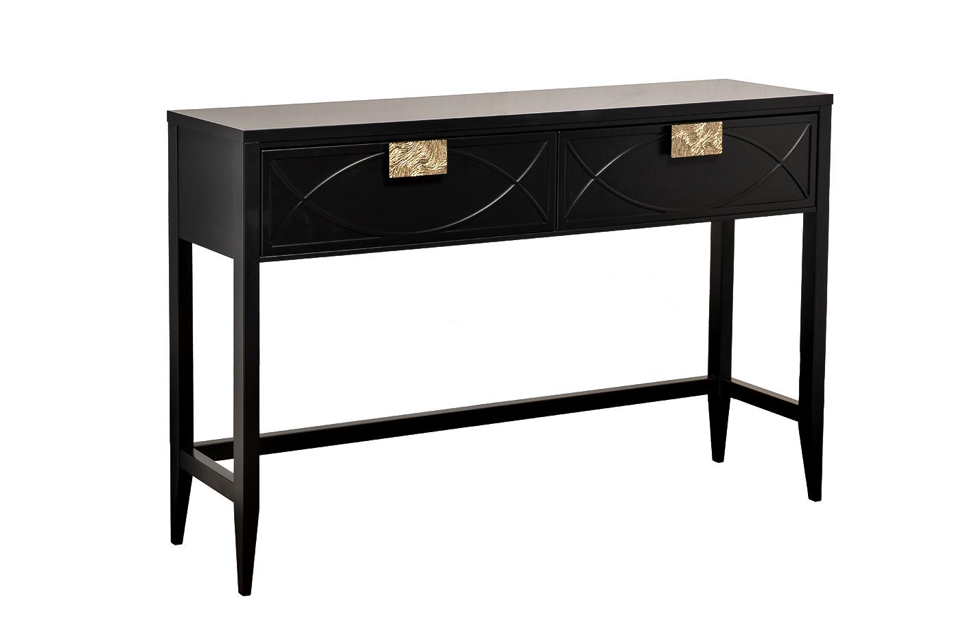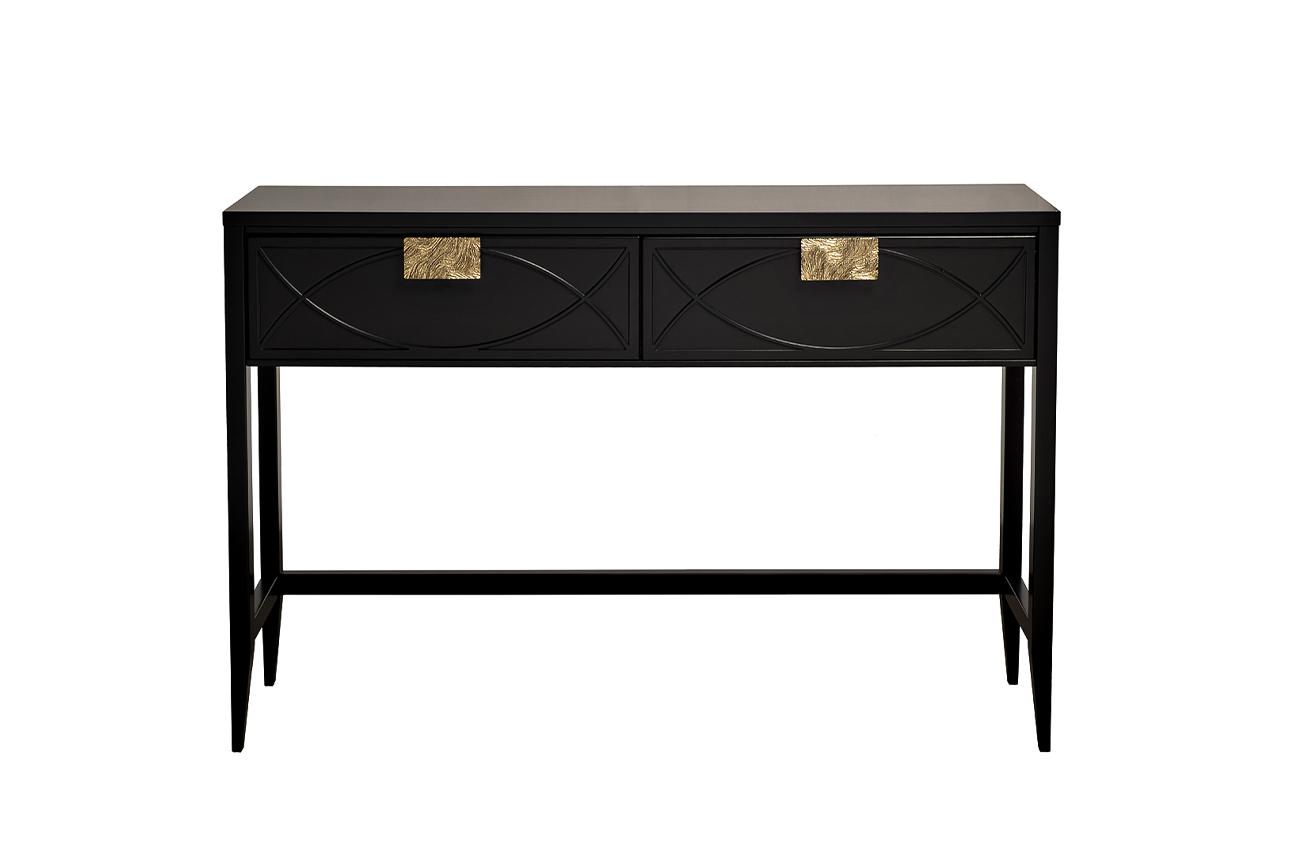 Дизайнерская консоль в стиле ар-деко - авторская разработка студии Garda Decor. Черный матовый фасад украшен объемным дугообразным декором и широкими рельефными ручками золотого цвета (глянцевое золото). Два выдвижных ящика прекрасно подойдут для хранения...