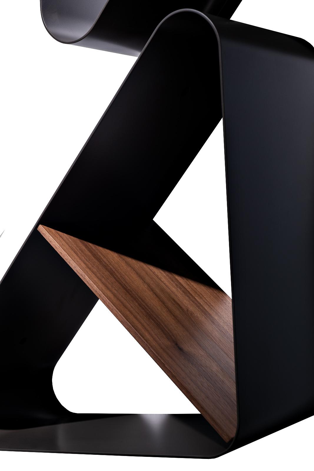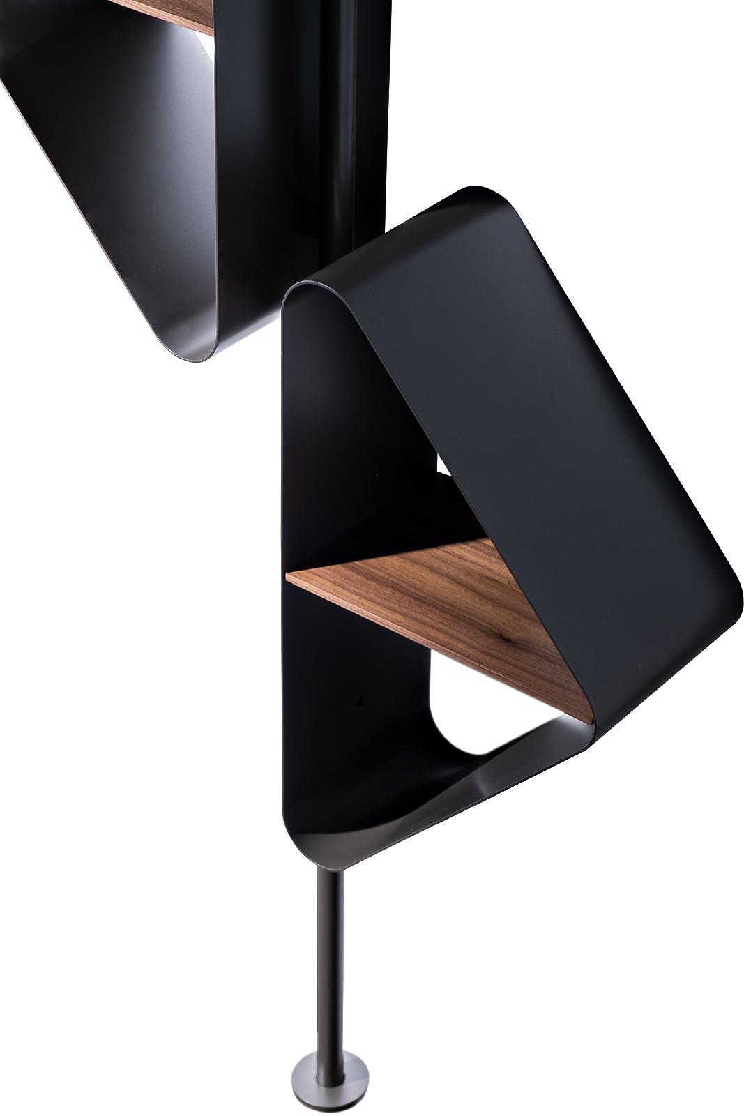 description-full - Выразительный декоративный стеллаж в сочетании металла и шпона создан для интерьеров с ярким характером и архитектурной подачей. "Пластичный" металлический каркас формирует динамичную геометрию, а тёплые деревянные полки смягчают графичность формы, создавая выразительный контраст материалов. Скульптурный силуэт делает модель самостоятельным арт-объектом в пространстве. Вертикальная конструкция превращает стеллаж для книг и декора в функциональный акцент для хранения аксессуаров, коллекционных предметов или любимых изданий. Модель особенно органично смотрится в интерьерах в стиле авангард, contemporary и авторский минимализм, подчёркивая смелость дизайнерского решения и индивидуальность пространства.