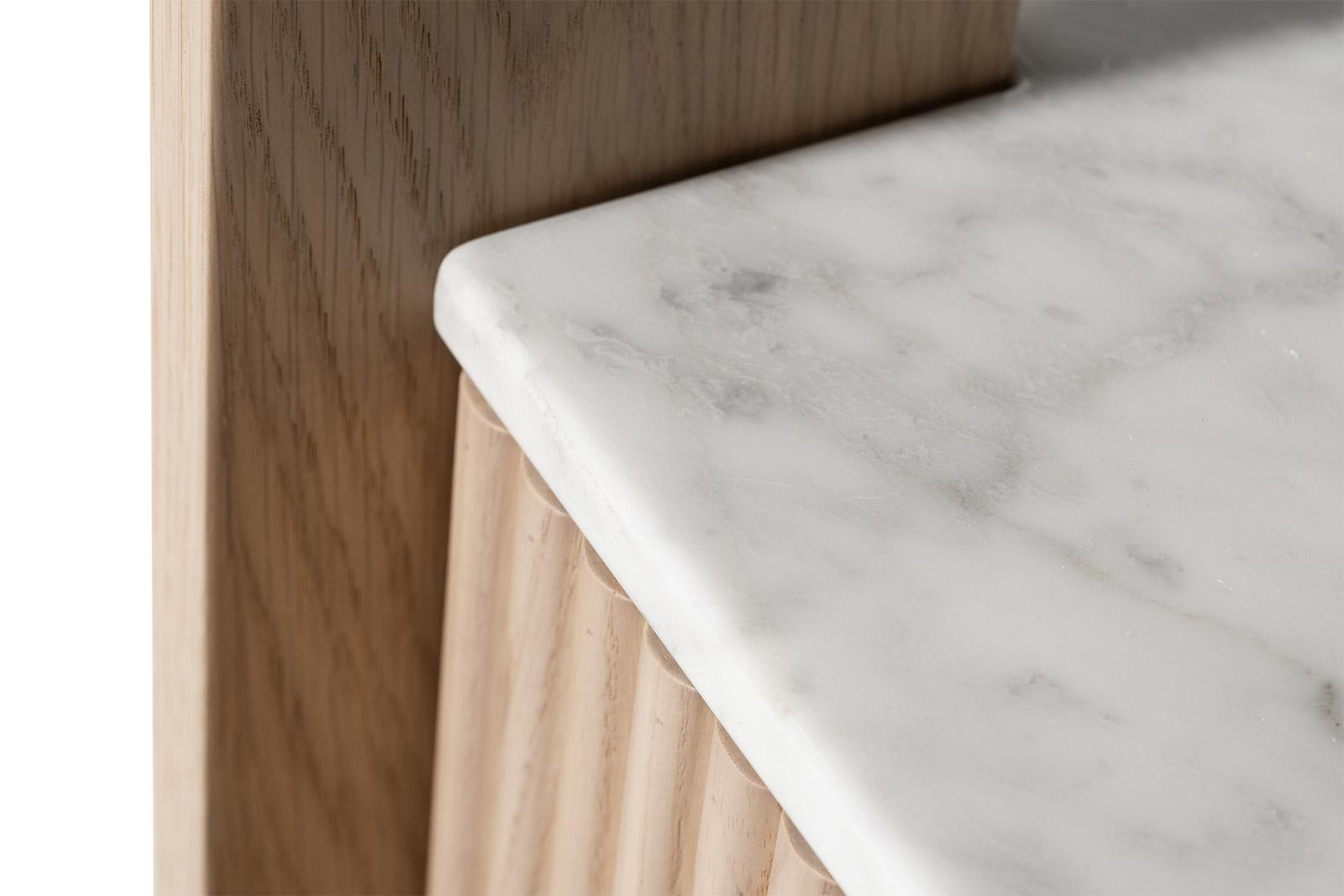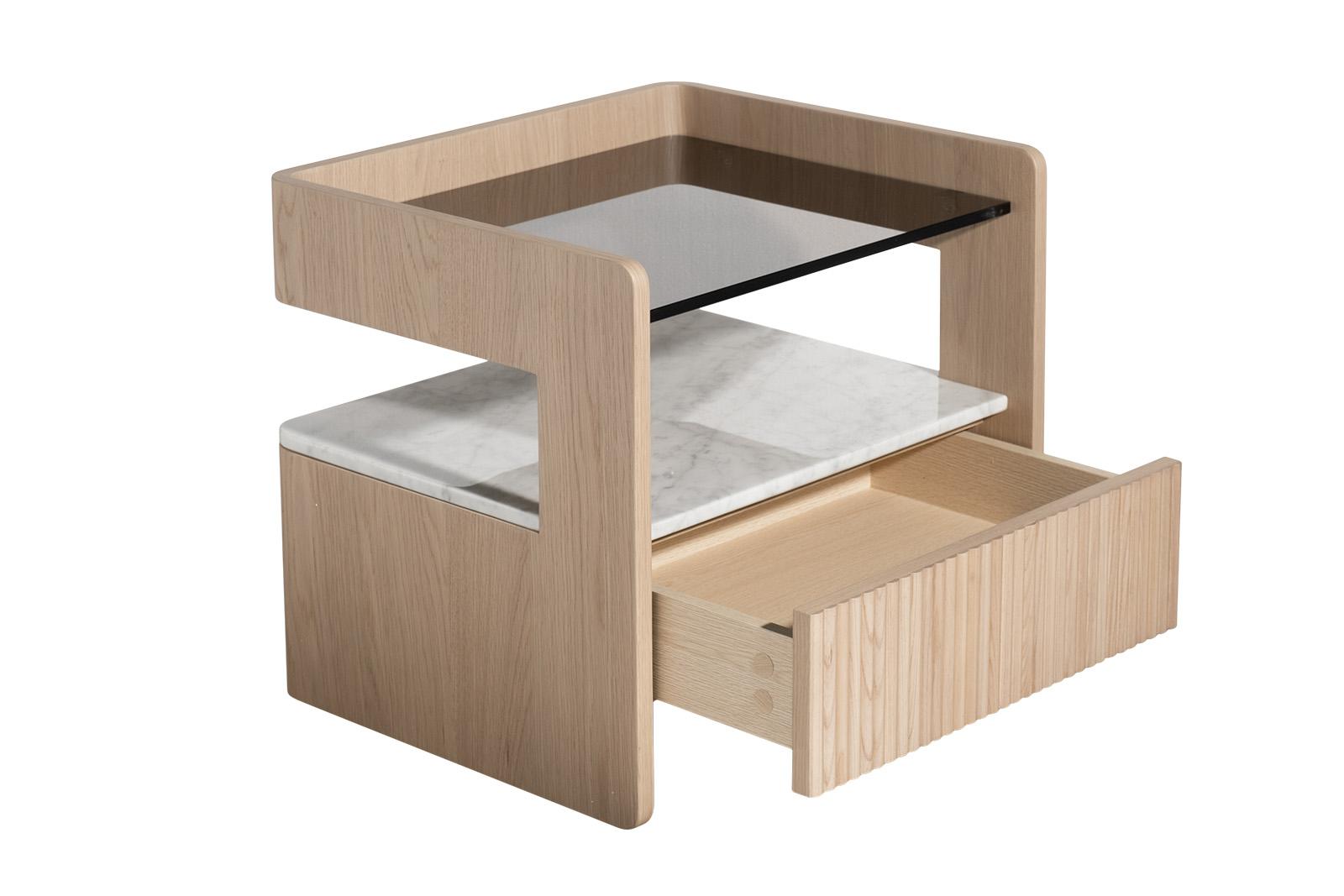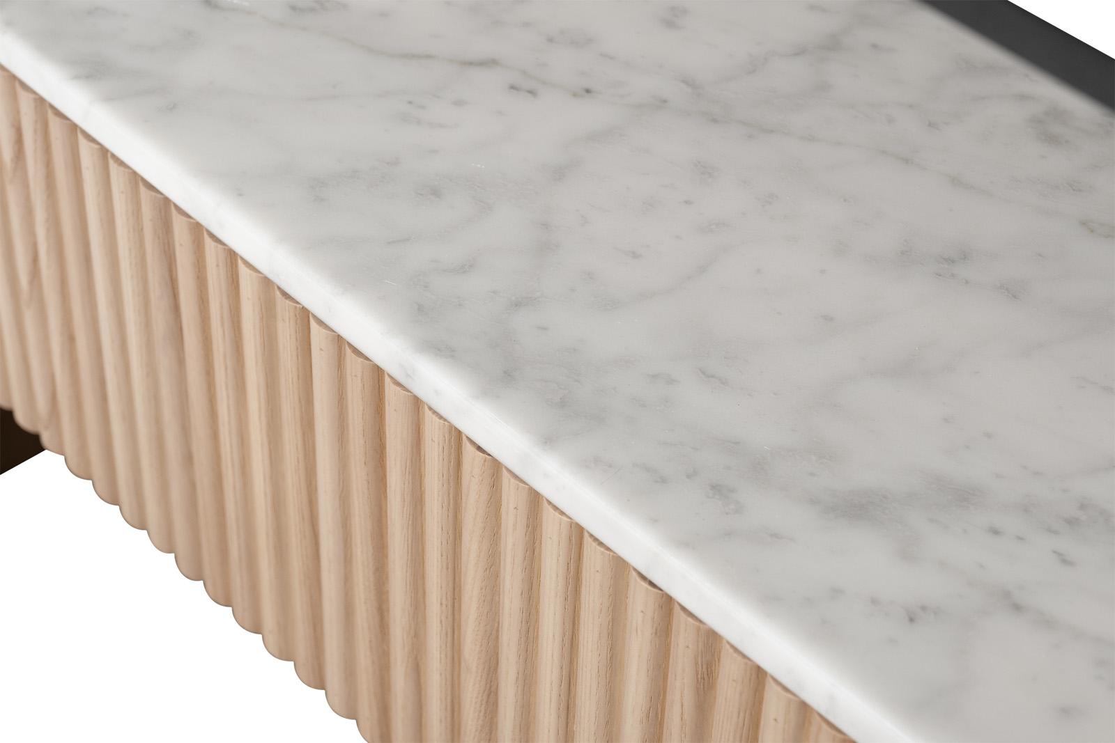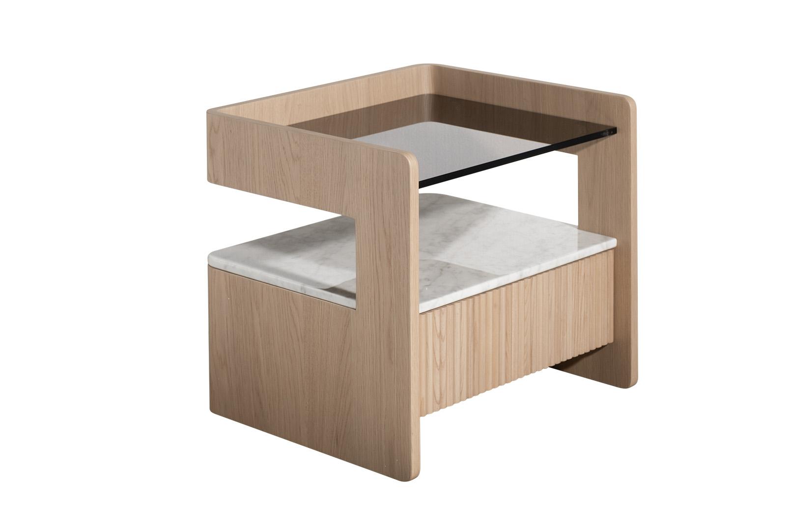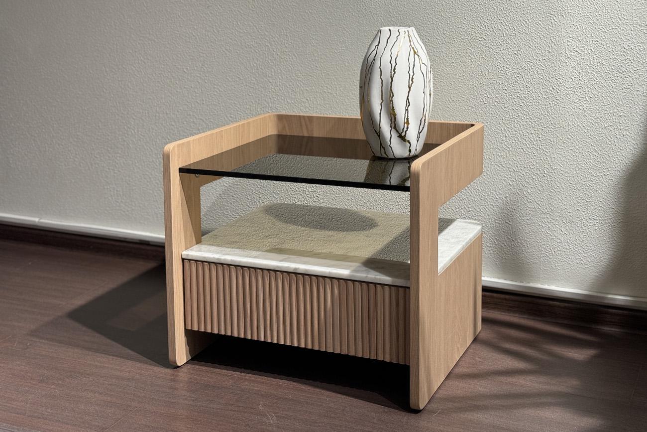 description-full - Светлая тумбочка с мраморной столешницей — тонкий баланс между уютом и роскошью. Её корпус из МДФ с текстурой светлого дерева обрамляет полку из прозрачного стекла — лёгкую, будто парящую над основанием. Столешница из натурального мрамора с нежными серыми прожилками уникальна — как отпечаток времени. Ящик спрятан за рельефной панелью, открывается без ручек — плавно, почти бесшумно. Идеальна для спальни или гостиной в стиле ар-деко или фьюжн — где светлая тумбочка с ящиком становится акцентом пространства. Это дизайнерская тумбочка с натуральным мрамором — сдержанная, но выразительная, элегантная без пафоса.