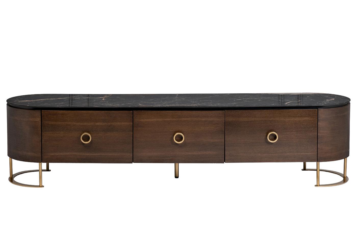description-full - Аристократичная длинная тумба под телевизор – эффектное и практичное решение для гостиной или спальни. Она позволяет организовать удобное хранение вещей, техники и документов, и при этом является красивой подставкой под телевизор, интерьерный декор. Благодаря классическому коричневому цвету тумба под ТВ легко вписывается в интерьер гостиной, гармонирует с другой современной мебелью обстановки. Особенности модели – столешница из керамогранита с мраморным рисунком, полукруглые опоры и фурнитура из металла с эффектом позолоты. Компания Garda Decor предлагает купить тумбу под телевизор с доставкой по РФ, а также любую другую мебель в стилистике ар-деко.