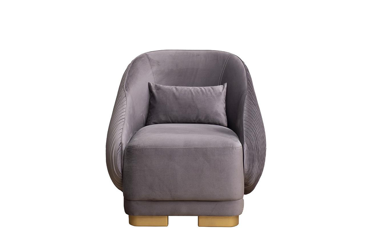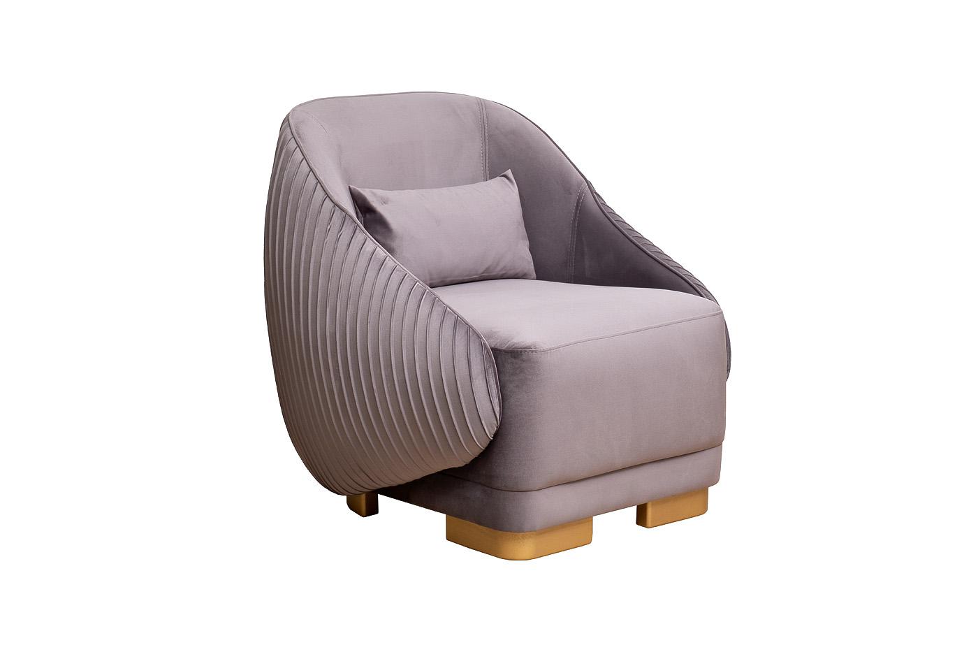 description-full - Велюровое серое кресло Палаццо(Palazzo) – эксклюзивная разработка дизайнеров Garda Decor. Оно станет прекрасным дополнением к дивану Палаццо(Palazzo) или самодостаточным предметом обстановки в гостиной, спальне, холле, рабочем кабинете или лаунже. Элегантное кресло из велюра отвечает актуальным интерьерным трендам и органично вписывается в жилое пространство. Удобную посадку обеспечивают мягкая спинка с подлокотниками и декоративная подушка. За устойчивость, прочность и долговечность мебели отвечают деревянный каркас и ножки, а оригинальности придает обивка с эффектом плиссе. Мы предлагаем изготовить стильное кресло под заказ в различных вариантах ткани. Габариты кресла: длина- 81см, глубина- 81см, высота79см. В стандартном исполнении кресло представлено в тканях Романтика 504(основная) и Романтика 504,плисированная ткань(спинка), передние опоры цвет золото. В комплект кресла входит 1 декоративная прямоугольная подушка спинки.Опоры дерево, цвет №8.