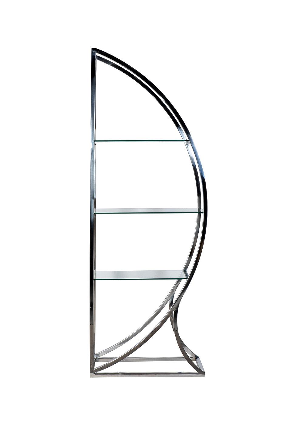 description-full - Необычный дизайнерский стеллаж станет настоящим украшением гостиной или кабинета. Каркас из полированной стали цвета хром дополнен тремя полками из прозрачного закаленного стекла. Стеллаж, напоминающий парус, прекрасно смотрится как в одиночку, так и в паре с другим стеллажом, расположенным зеркально. Вазы, статуэтки, книжные тома и спортивные кубки получат достойное обрамление. Стеллаж выглядит дорого, модно и элегантно. Это любимый предмет интерьера многих современных дизайнеров, предпочитающих открытые полки и стеллажи в качестве альтернативы традиционным витринам и шкафам.