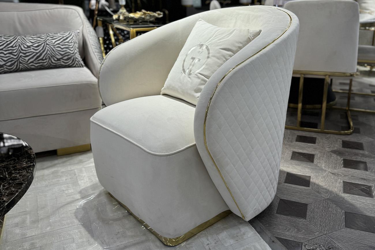 description-full - Мебель светлых оттенков - современный тренд. В данном кресле сочетается мягкий велюр нежного оттенка слоновой кости, золотое основание из нержавеющей стали и простроченная спинка. Чтобы добавить пространству красоты и уюта, можно купить велюровое кресло, которое будет радовать вас изящностью и комфортом долгие годы. Модель выполнена из качественных материалов: отделка из нержавеющей стали и каркас из массива дерева делают изделие особенно прочным, а мягкая обивка создаёт уют и задаёт неповторимый стиль. Кремовое кресло Ольтен (Olten) отличается своей изысканностью и обтекаемыми формами. Оно прекрасно дополнит современный интерьер, подойдёт для спальни, кабинета, гостиной или холла. Округлое кресло с мягкой подушкой идеально как для работы за столом, так и для отдыха. В комплект входит подушка 50*50см с вышивкой эмблема. Габариты сиденья: ширина 62см, глубина 58см, высота от пола 46см