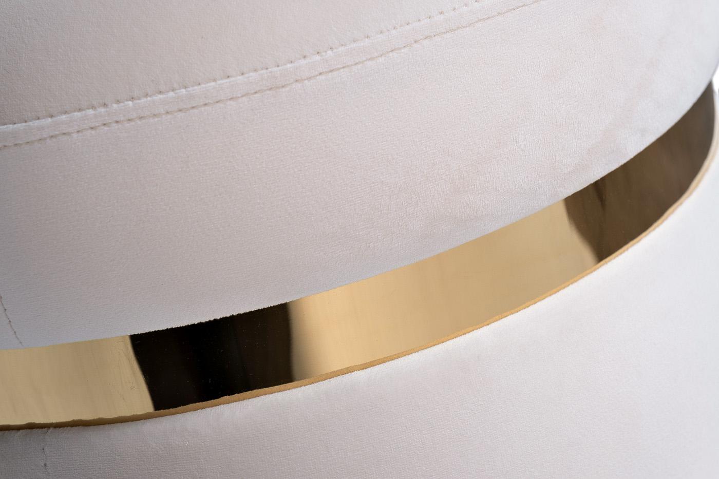 description-full - Мебель светлых оттенков - современный тренд. Пуф выполнен в мягком велюре нежного оттенка слоновой кости с золотой отделкой из нержавеющей стали. Купив пуф в прихожую, можно существенно сменить дизайнерские акценты и обновить домашнее пространство. Велюровый пуф – прекрасное дополнение к интерьеру и отличный помощник для грамотного зонирования домашнего или рабочего пространства. Круглый пуф выполнен в кремовом цвете и декорирован золотистой отделкой. Такое изящное сочетание не оставит вас равнодушными. Пастельный кремовый оттенок ассоциируется с гармонией и уютом.