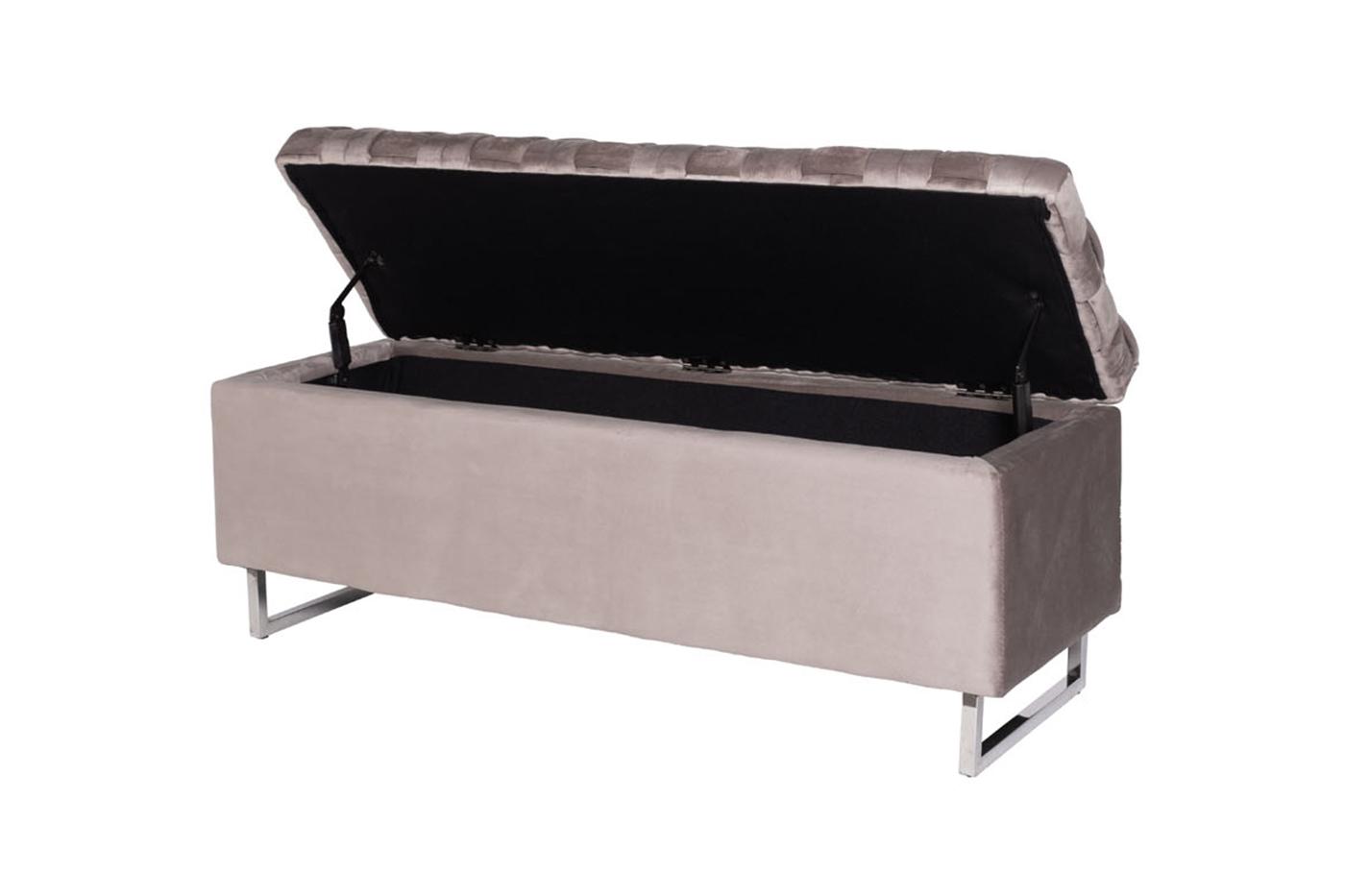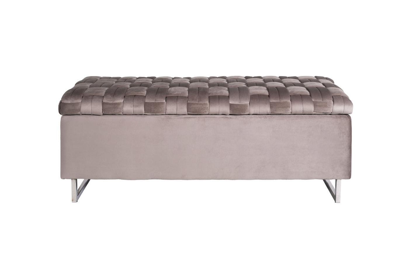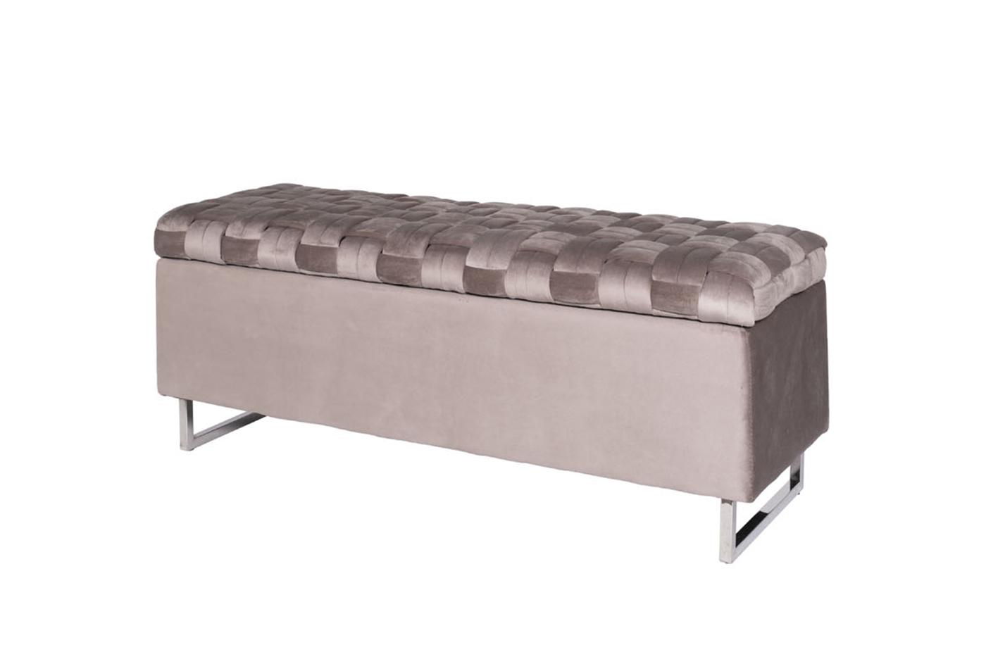 description-full - Функциональная банкетка с отсеком для хранения объемом 108*28*25см с интересной отделкой сиденья из плетеных лент ткани с наполнителем ППУ внутри. Нейтральный серо-бежевый цвет велюра c опорами из нержавеющей стали и удобство дают возможность вписать такой предмет мебели в разнообразные варианты интерьера с разным функционалом - и для прихожей, и для спальни.
