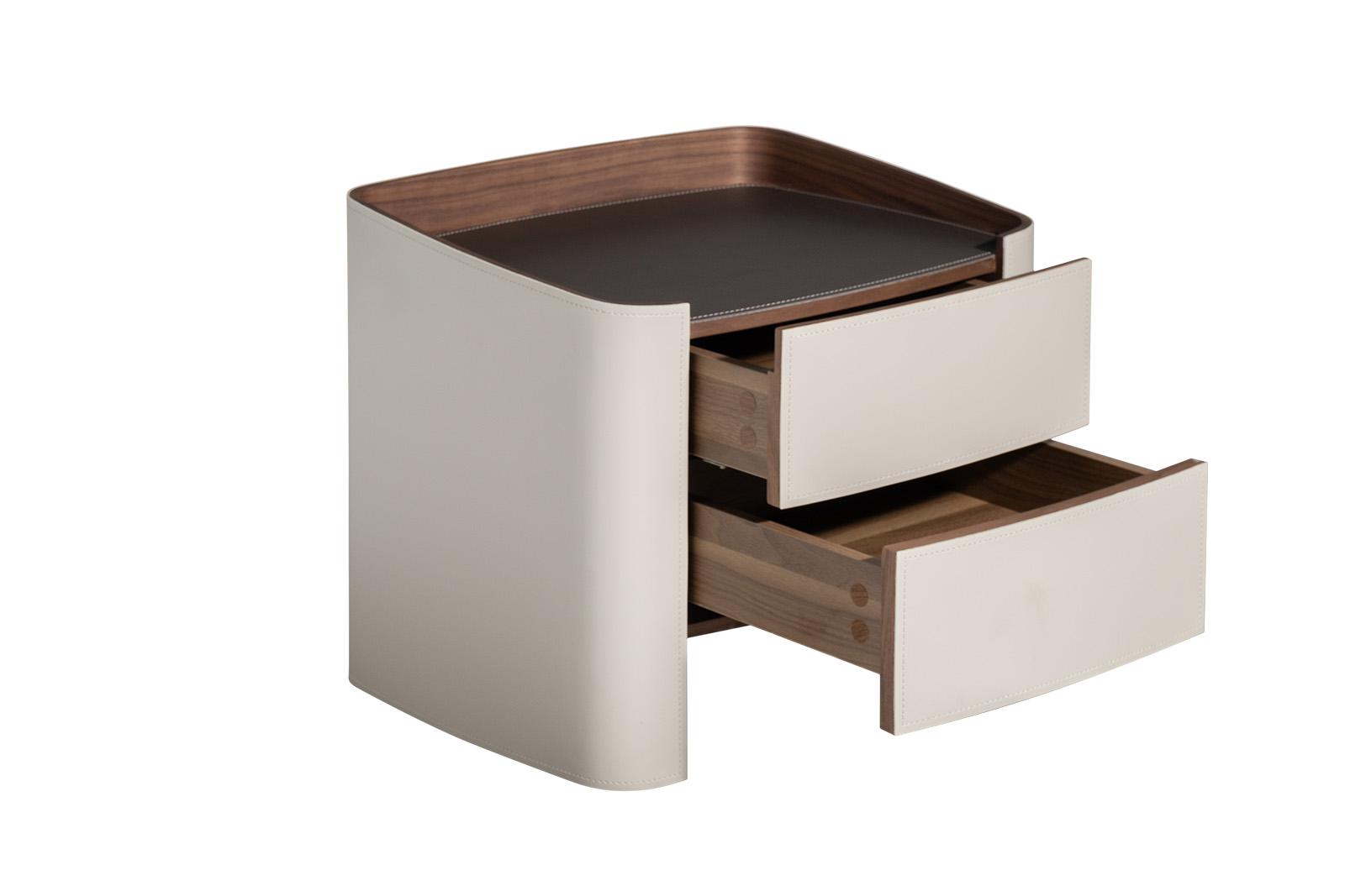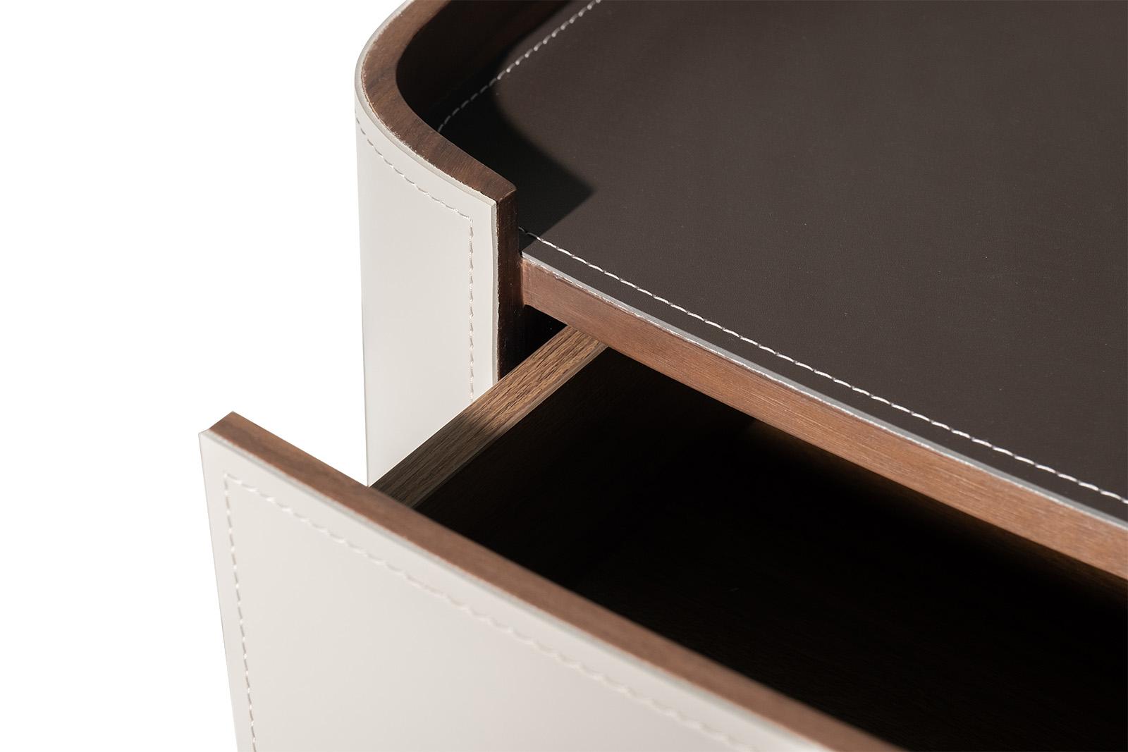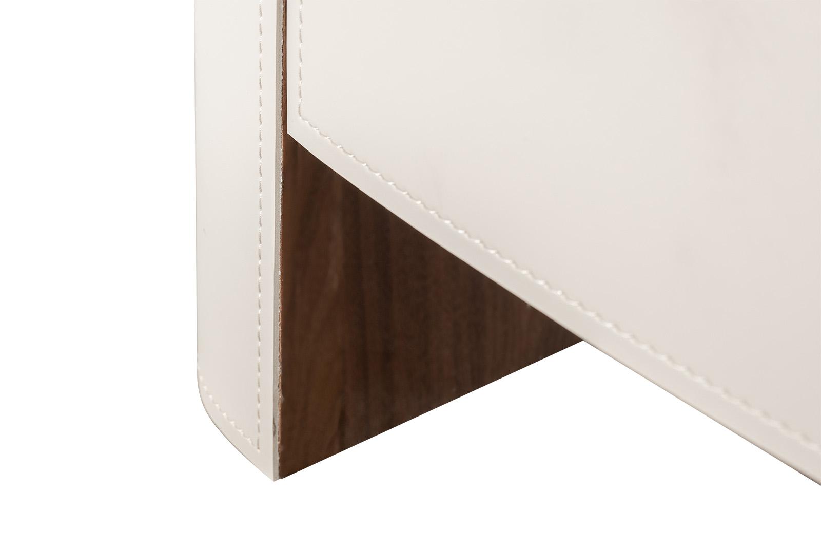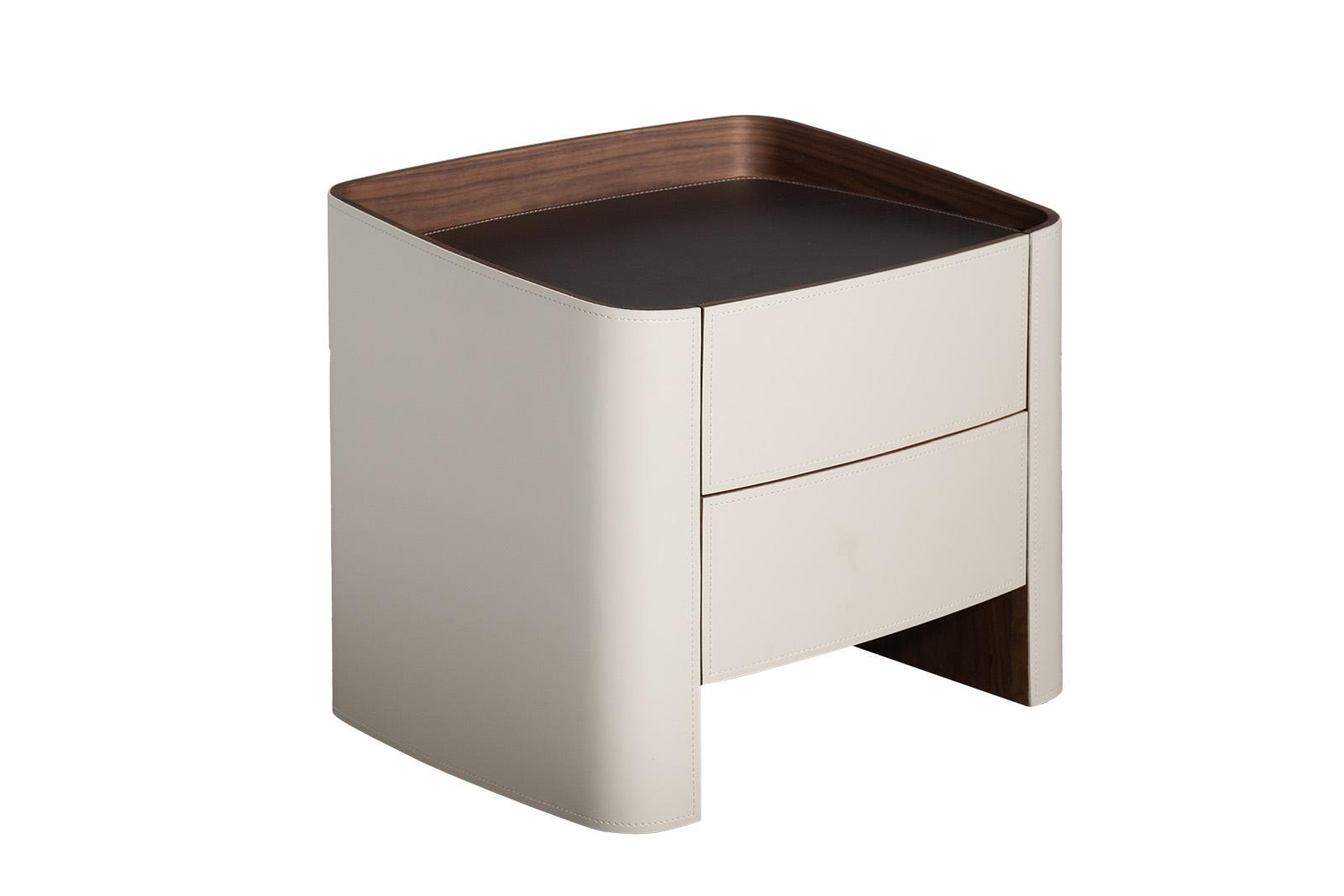 description-full - Тумбочка с двумя ящиками в светлом оттенке — утончённый акцент для спальни или гостиной, где важна лёгкость и тактильная теплота. Её корпус обтянут мягкой текстурой, напоминающей кожу, с едва заметной прострочкой по краям — деталь, которая говорит о внимании к мелочам. Верхняя часть с тёмной отделкой создает контраст, добавляя глубину и благородство. Ящики открываются плавно, без ручек — их фасады слегка выпуклые, словно приглашают касаться. Идеальна для интерьеров в стиле ар-деко или фьюжн — где светлая тумбочка становится не просто местом для хранения, а элементом композиции. Это дизайнерская тумбочка, в которой каждая линия продумана: не для глаз — для ощущения. Материалы и форма работают вместе, создавая баланс между уютом и элегантностью.