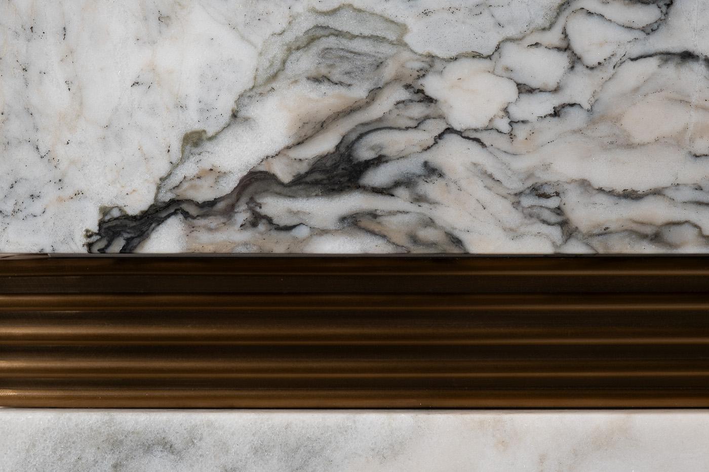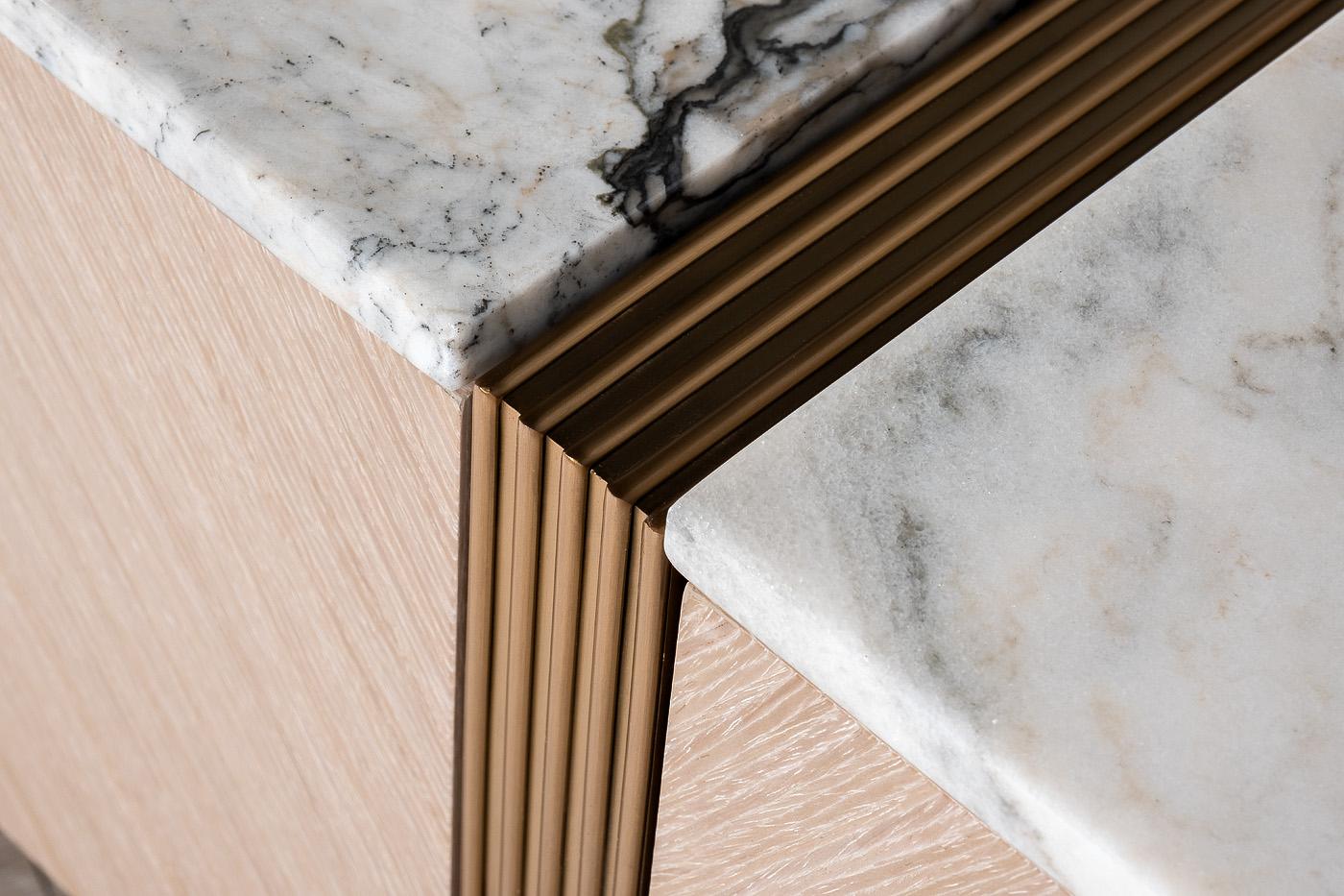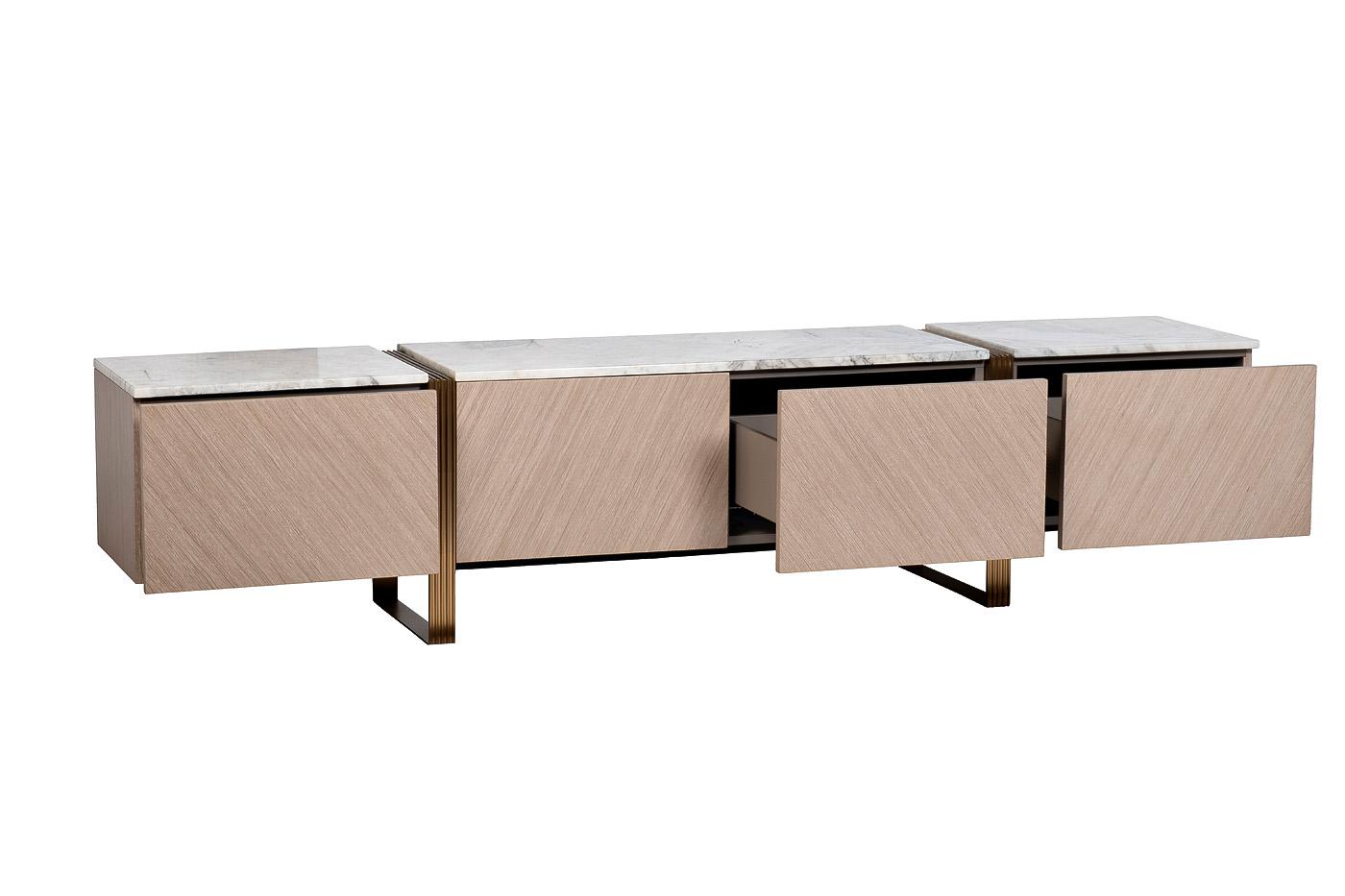 description-full - Длинная тумба под телевизор – универсальное решение для современной гостиной или спальни. Данная мебель позволяет организовать функциональную ТВ-зону и удобное хранение домашних вещей. Мраморная столешница тумбы прекрасно справляется с функцией подставки под телевизор и декор. Благодаря светлому оттенку шпона стильная тумба под ТВ прекрасно комбинируется с современной мебелью. Особенность данной модели – металлические опоры, одновременно являющиеся частью фасада. Купить тумбу под телевизор можно с доставкой по РФ, а также дополнить ее любой другой мебелью и декором в модной стилистике ар-деко.Столешница вырезана из натурального мрамора! Рисунок и цвет каждой столешницы индивидуален, неповторим и уникален!